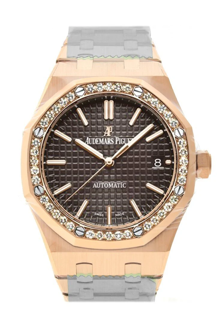 18kt pink gold case with a 18kt pink gold bracelet. Fixed diamond set bezel. Brown grande tapisserie pattern dial with gold-tone hands and index hour markers. Minute markers around the outer rim. Dial Type: Analog. Luminescent hands and markers. Date display at the 3 o'clock position. Audemars Piguet Calibre 3120 automatic movement with a 60-hour power reserve. Scratch resistant sapphire crystal. Case size: 37 mm. Case thickness: 9.8 mm. Round case shape. Water resistant at 50 meters / 165 feet. Functions: date, hour, minute, second. Additional Info: 40 brilliant-cut diamonds; ~0.92 carats (bezel). Luxury watch style. Watch label: Swiss Made