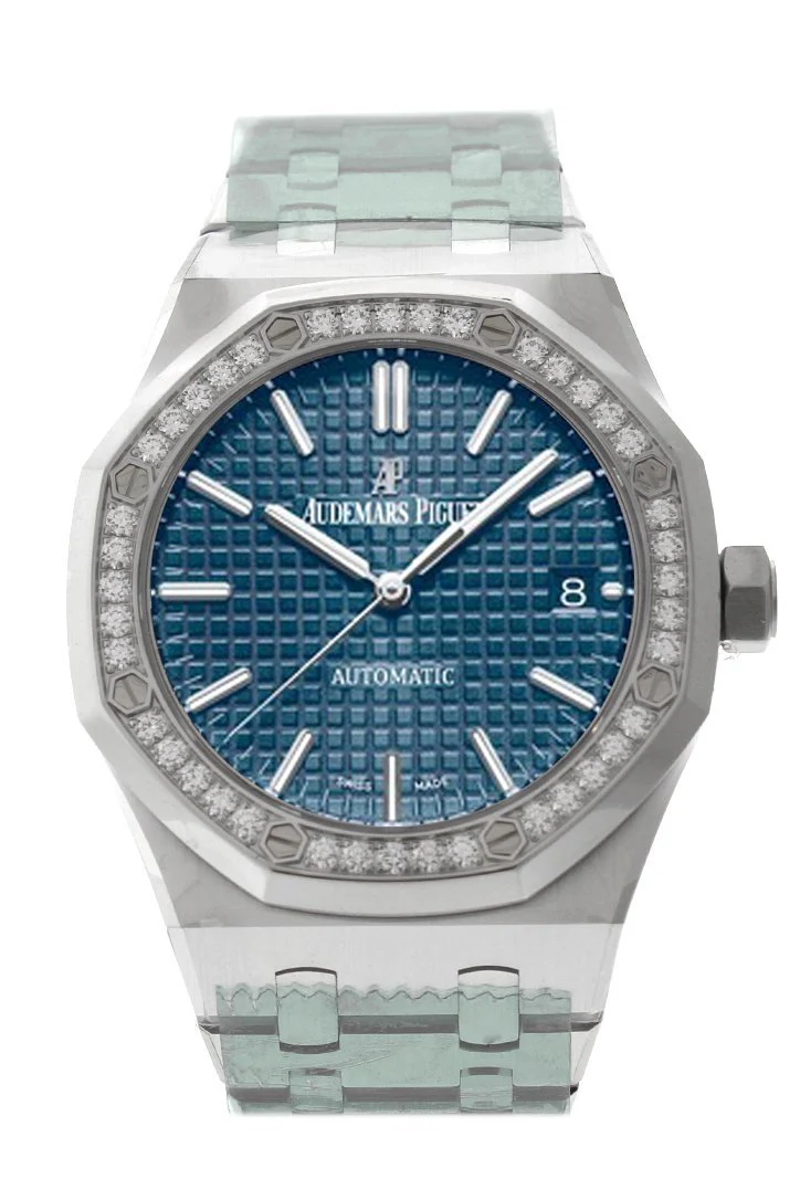 Silver-tone stainless steel case with a silver-tone stainless steel bracelet. 8 screws fixed silver-tone diamond set bezel. Blue with grande tapisserie pattern dial with silver-tone hands and index hour markers. Minute markers around the outer rim. Dial Type: Analog. Luminescent hands and markers. Date display at the 3 o'clock position. Audemars Piguet Calibre 3120 Automatic movement, containing 40 Jewels, composed of 280 parts, bitting at 21600 vph, and has a power reserve of approximately 60 hours. Scratch resistant sapphire crystal. Screw down crown. Transparent case back. Octagon case shape, case size: 37 mm, case thickness: 9.8 mm. Ap folding clasp. Water resistant at 50 meters / 165 feet. Functions: date, hour, minute, second. Luxury watch style. Watch label: Swiss Made.