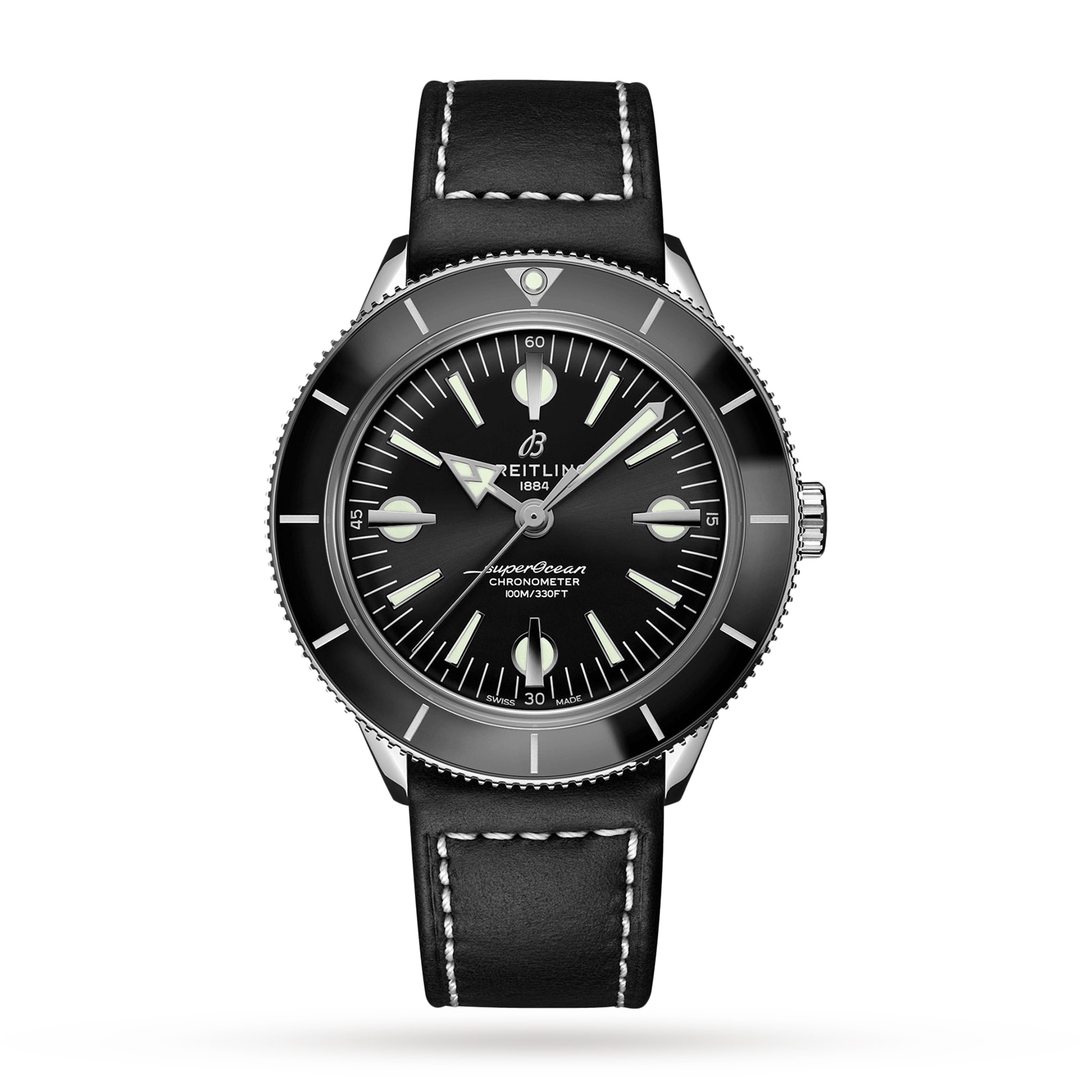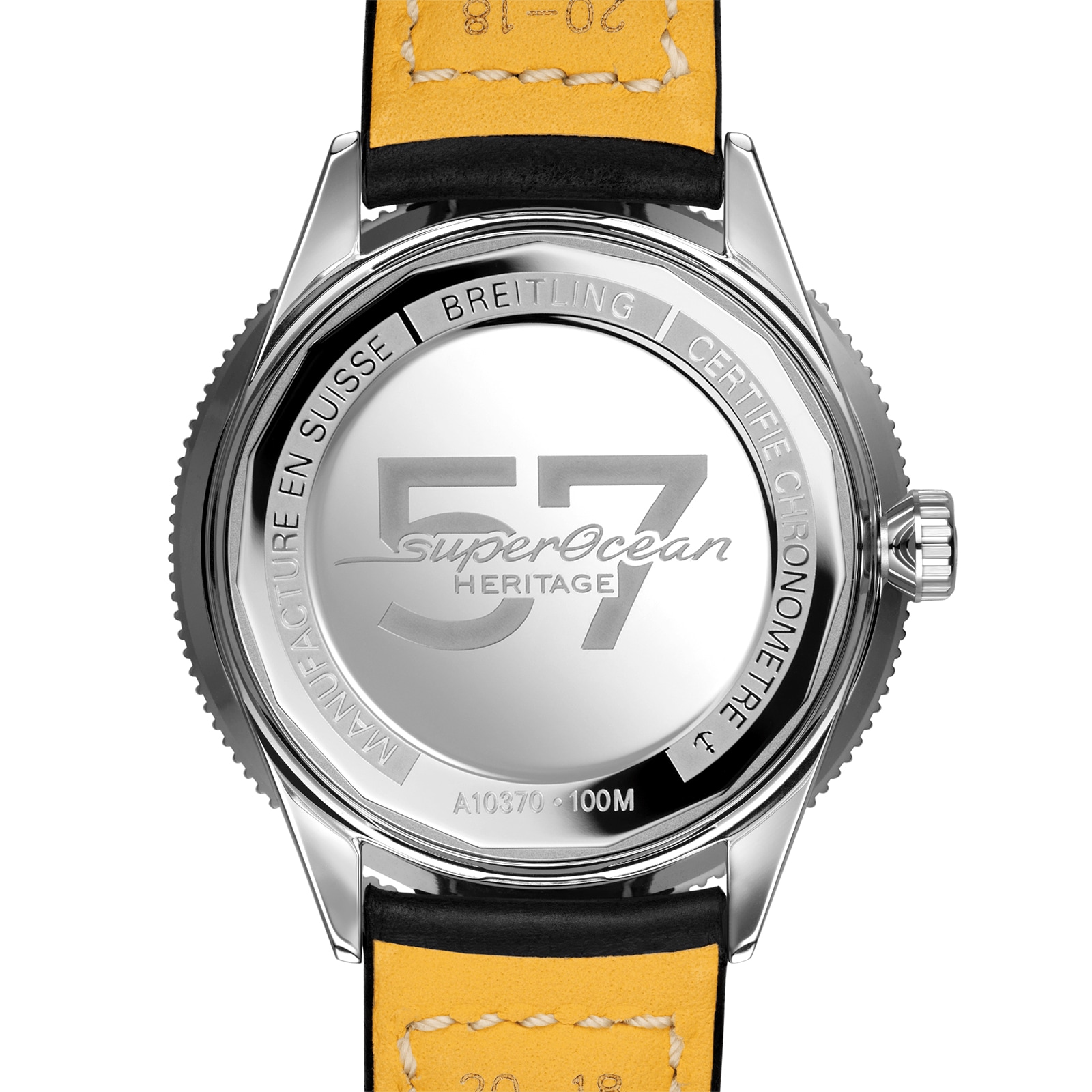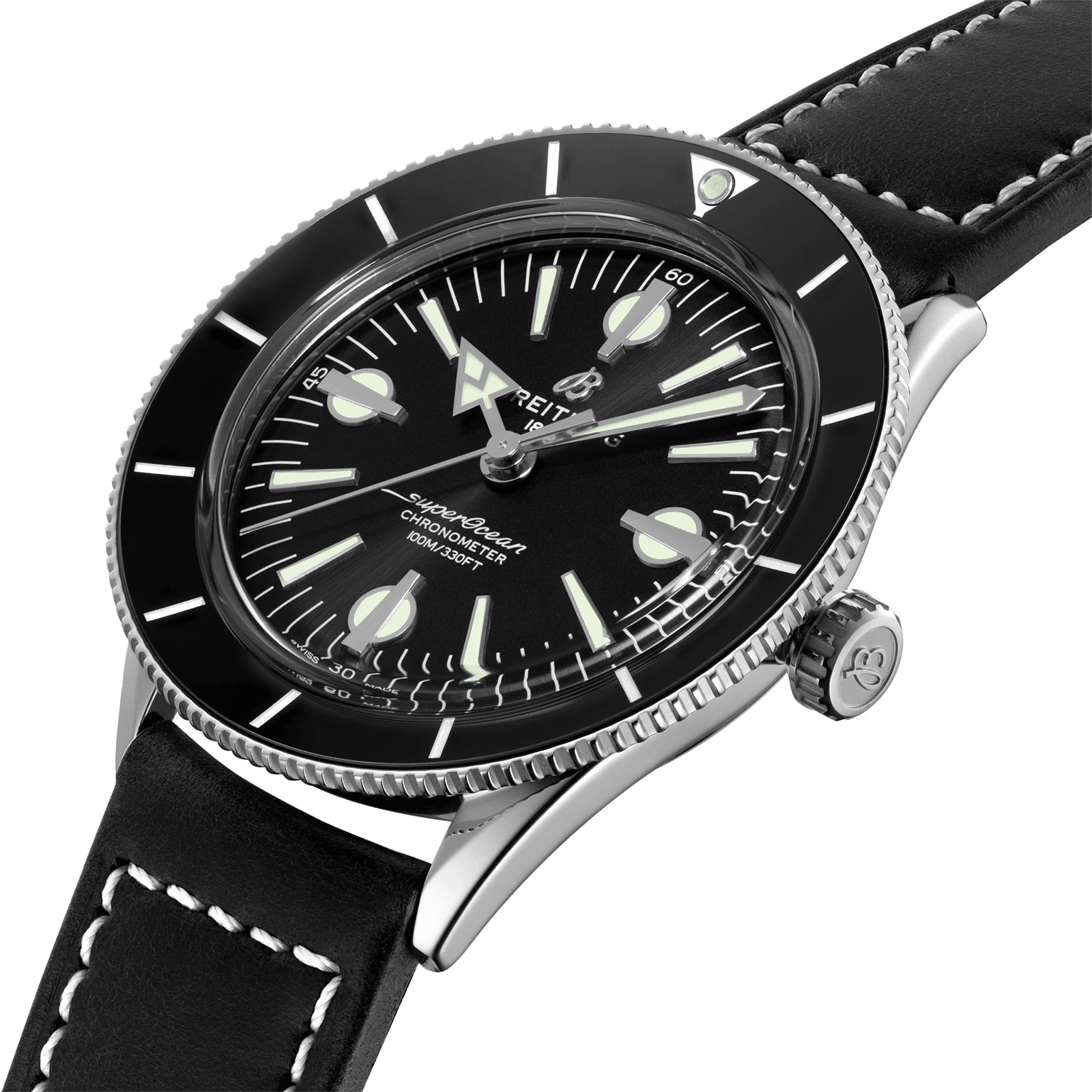 The Superocean Heritage '57 Capsule collection pays tribute to the original 1957 SuperOcean and the cool, laid-back surfing lifestyle of the 1960s. Available in a variety of materials including stainless steel and 18k red gold, the 42 mm case features two signature elements of the original SuperOcean: a concave bidirectional ceramic bezel and a dial featuring oversized indices. Paired with a mesh bracelet or a black, brown or gold calfskin leather strap that fits both a stainless-steel pin or folding buckle, the Superocean Heritage 57 is powered by the Breitling Caliber 10, a COSC-certified chronometer.