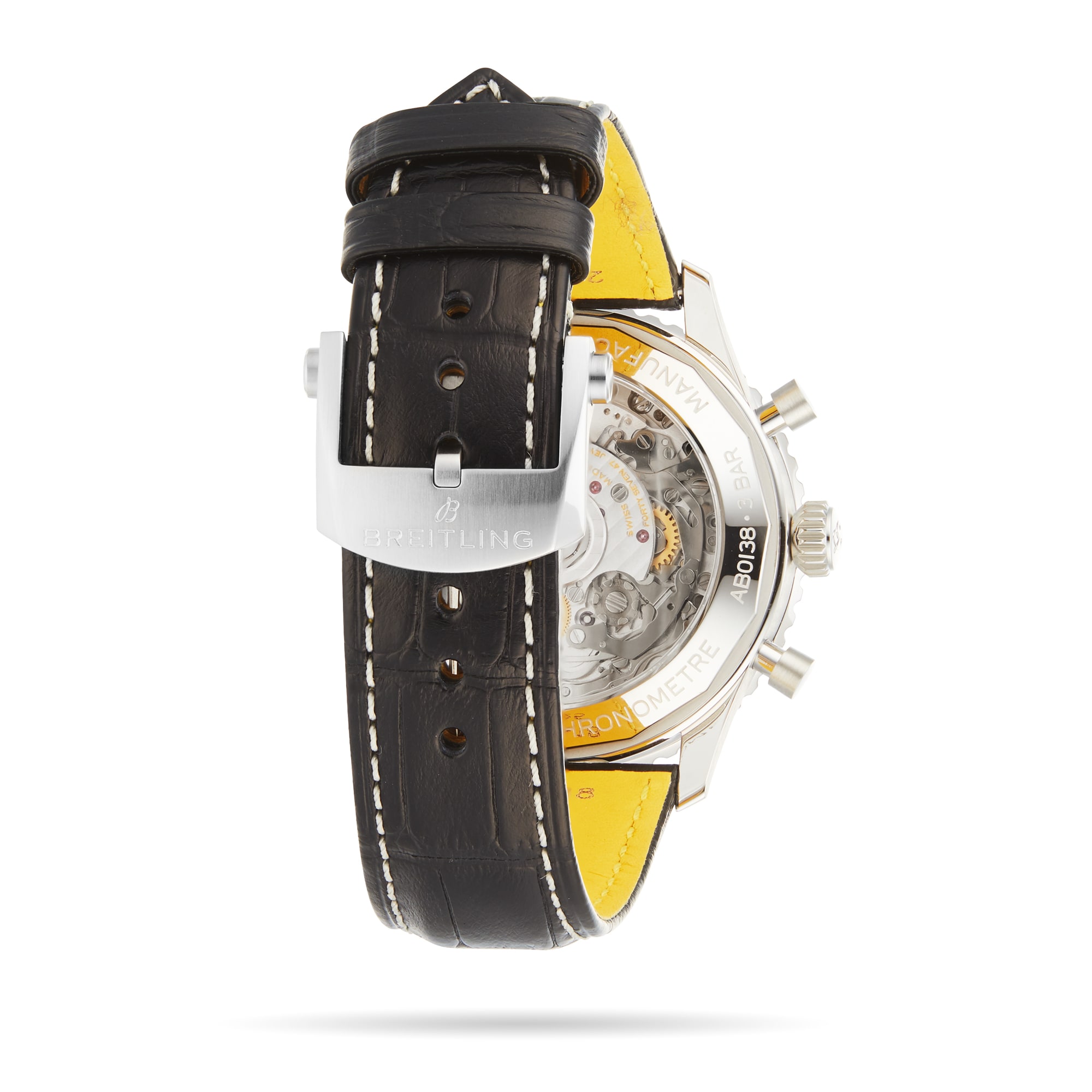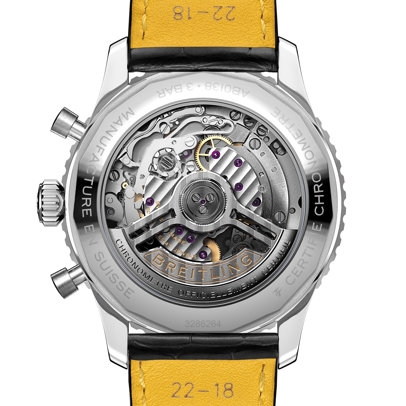 The iconic AOPA wings return to their original 12 o clock position on the dial for a hint of nostalgia, with an open-caseback allowing an uninterrupted view of the COSC-certified Breitling 01 calibre movement.