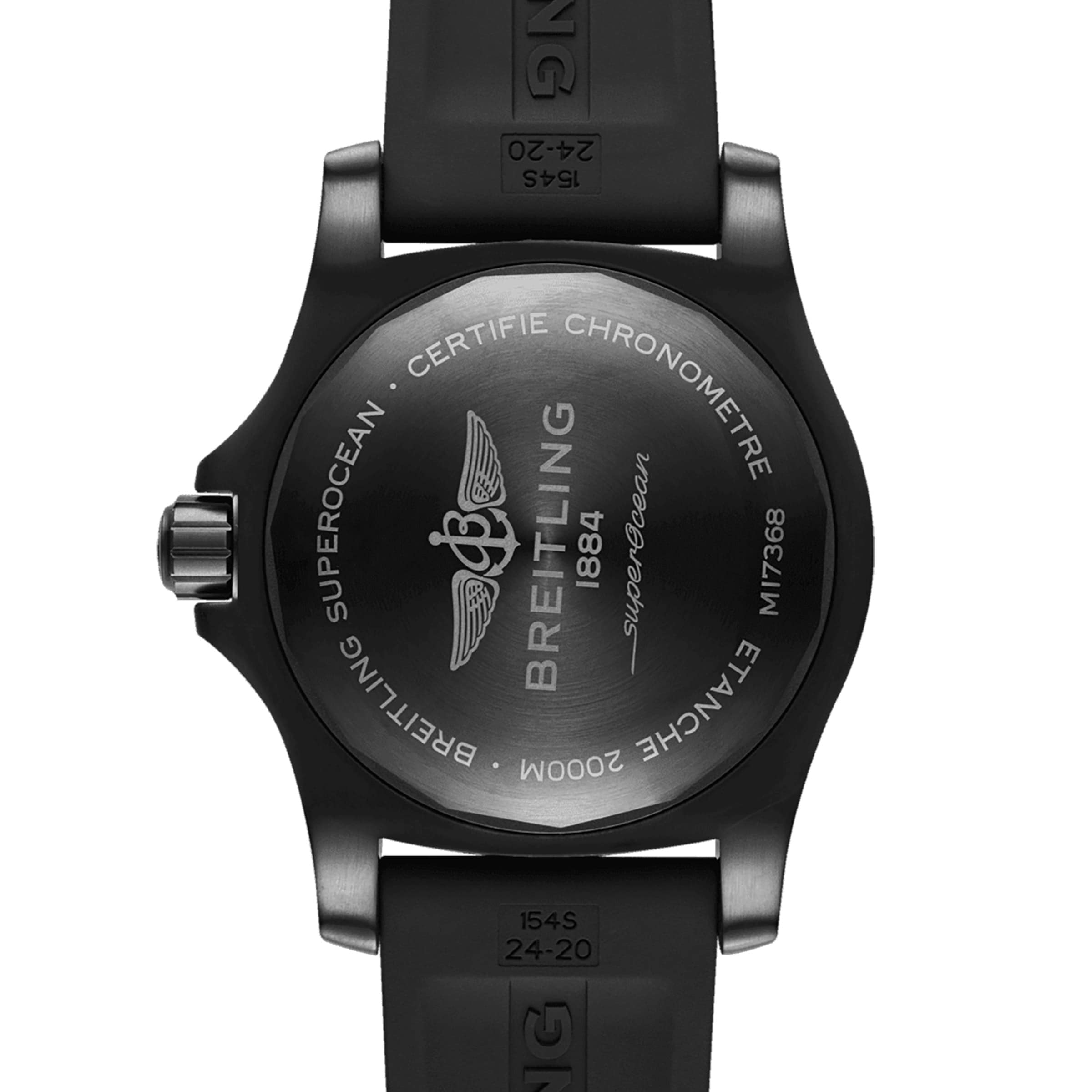 Power, functionality and cool, contemporary style define Breitling s Superocean Automatic collection: tool watches for the active, modern diver. Built to last, the Superocean Automatic 46 features a sturdy 46-mm black steel (DLC-coated stainless steel) case, black dial and a matching Diver Pro III rubber strap with pin buckle or folding clasp. Complete with ratcheted unidirectional bezel, and water-resistant up to an impressive 200 bar (2000 meters), it is the ultimate in robustness and reliability for deep-sea adventurers.