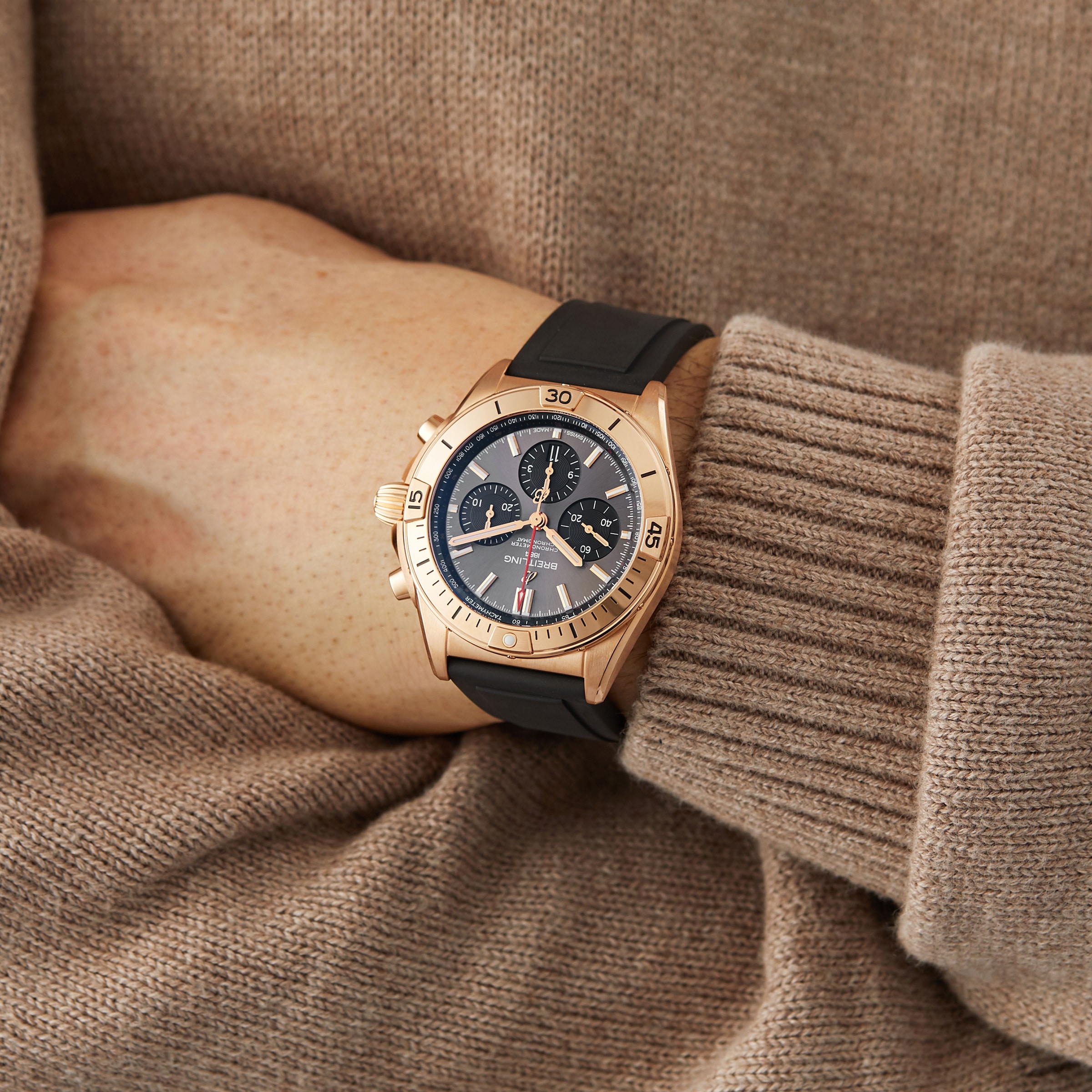 This Chronomat B01 42 is characterised by a robust, 18K red gold case and the iconic bezel with four rider tabs.