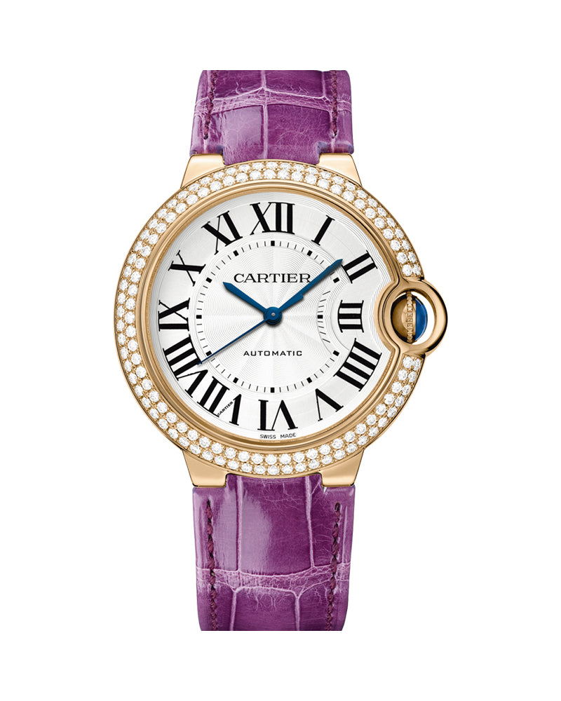 Ballon Bleu de Cartier watch, 36 mm, self-winding mechanical movement. 18K pink gold case set with 123 brilliant-cut diamonds totaling 1.21 carats, fluted crown set with a sapphire cabochon, silvered guilloche lacquered opaline dial, blued-steel sword-shaped hands, sapphire crystal, purple leather strap, 16 mm 18K pink gold double adjustable folding buckle.