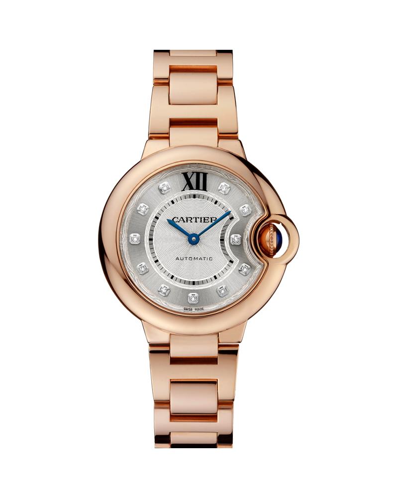 Ballon Bleu de Cartier watch, 33mm, Mechanical movement with automatic winding calibre Cartier 076, 18K pink gold case, 18K pink gold flueted crown set with a blue cabochon sapphire. Sapphire crystal, 12 zones flinque dial set with 11 brilliant-cut diamonds totaling 0.05 carats, silvered with sun-like finish and lacquer, 1 Roman numeral, sword-shaped blued-steel hands. 18K pink gold bracelet.