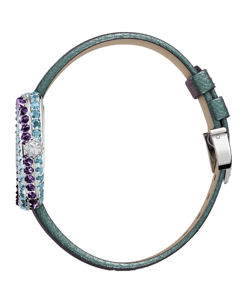 Coussin de Cartier watch, medium model, quartz movement. Rhodium-finish white gold 750/1000 case set with sapphires, aquamarines and amethysts, rhodium-finish steel sword-shaped hands. Rhodium-finish 18K white gold (750/1000) dial and crown set with 280 brilliant-cut diamonds totaling 1.40 carats. Purple calfskin strap, rhodium-finish white gold ardillon buckle set with 21 diamonds totaling 0.21 carats. Case dimensions: 30.4 mm x 31.1 mm. Thickness: 7.1 mm. Water-resistant up to 3 bar (approx. 30 meters/100 feet).