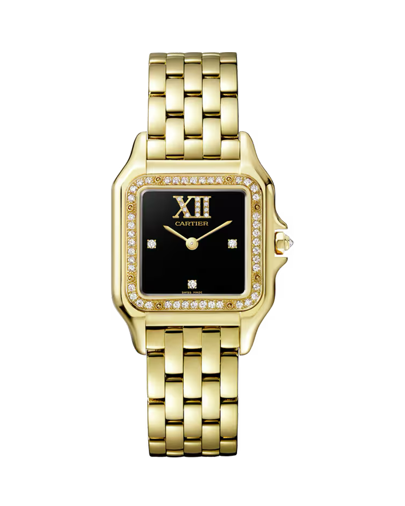 Panth re de Cartier watch, medium model, quartz movement. 18K yellow gold (750/1000) case set with 44 brilliant-cut diamonds totaling 0.28 carats. Dimensions: 36.5 mm x 26.7 mm, thickness: 6.8 mm. 18K yellow gold (750/1000) octagonal crown set with a brilliant-cut diamond totaling 0.02 carats. Black lacquer dial set with 15 brilliant-cut diamonds totaling 0.03 carats, golden-finish sword-shaped hands. 18K yellow gold (750/1000) bracelet. water-resistant up to 3 bar (approx. 30 meters/100 feet)