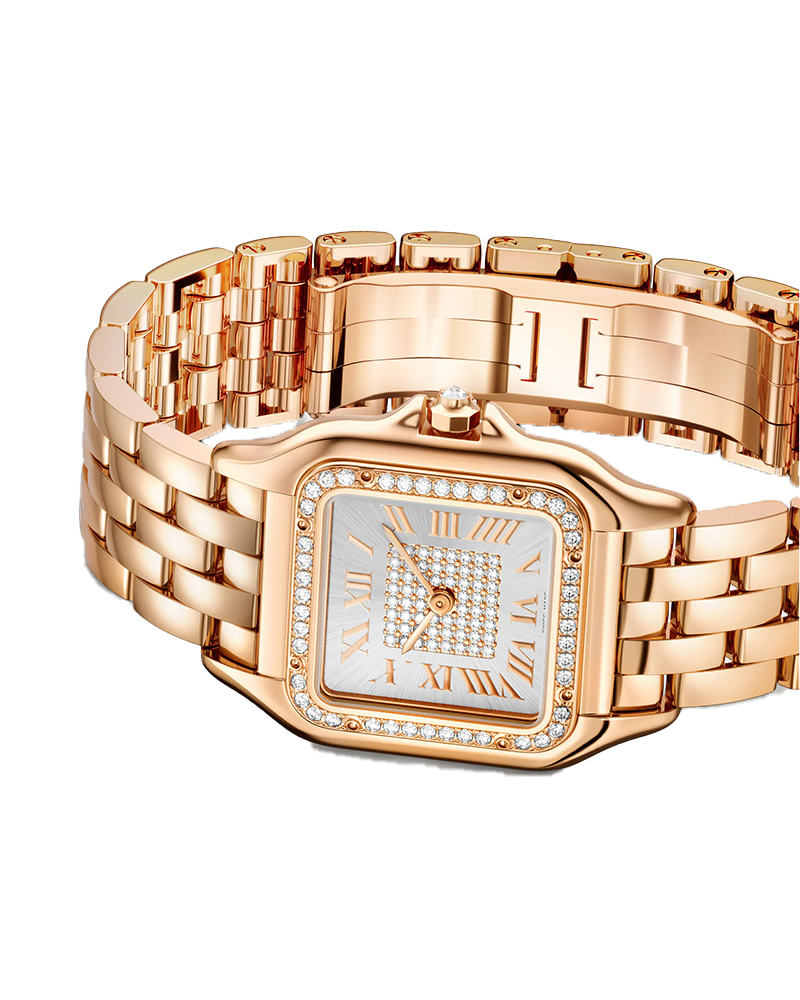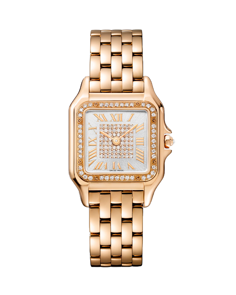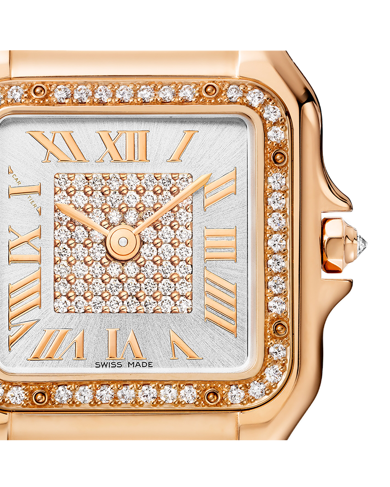 Panth re de Cartier watch, medium model, quartz movement. 18K rose gold (750/1000) case set with 44 brilliant-cut diamonds totaling 0.28 carats. Dimensions: 36.5 mm x 26.7 mm, thickness: 6.8 mm. 18K rose gold (750/1000) octagonal crown set with a brilliant-cut diamond totaling 0.02 carats. Silvered sunray-brushed dial set with 60 brilliant-cut diamonds totaling 0.22 carats, rose gold-finish sword-shaped hands. 18K rose gold (750/1000) bracelet. Water-resistant up to 3 bar (approx. 30 meters/100 feet).