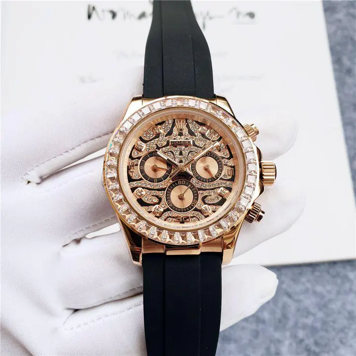 The index has factory-set diamonds with 18k yellow-gold hour marker surroundings except for the 3-, 6- and 9-hour position, which are 18k yellow-gold Arabic numerals (15, 30, 45 respectively).