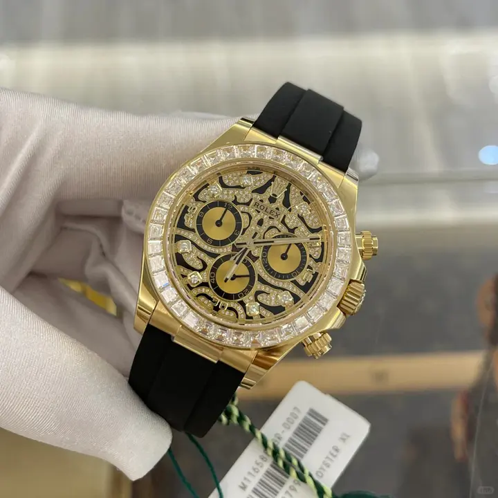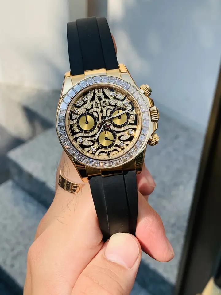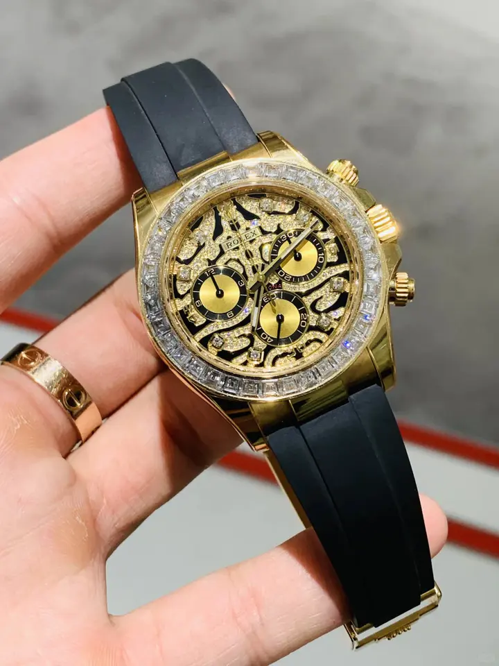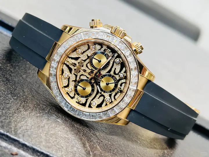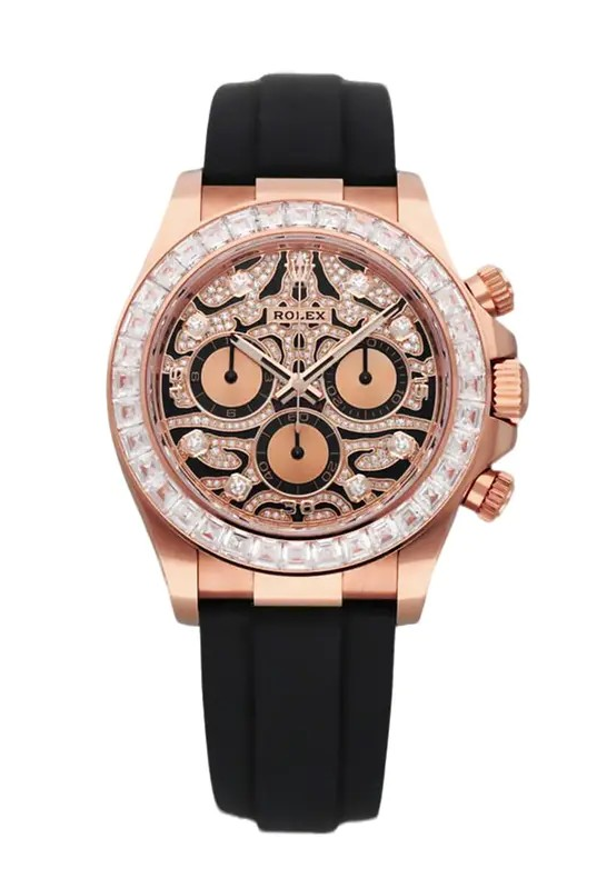 A Rolex Daytona with diamonds is not something new but one with a dial like the 116588TBR sure is! The black-lacquered dial has an applied 18k yellow-gold and diamond-set, wavy structure on the surface, which can remind you of a tiger's fur.