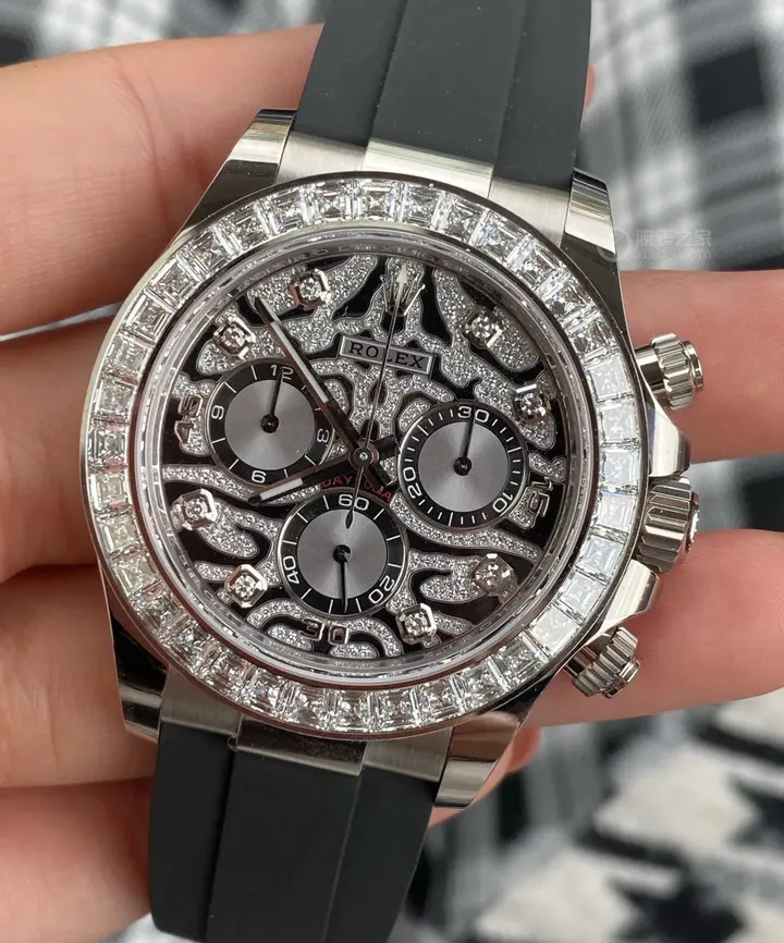 A Rolex Daytona with diamonds is not something new but one with a dial like the 116588TBR sure is! The black-lacquered dial has an applied 18k yellow-gold and diamond-set, wavy structure on the surface, which can remind you of a tiger's fur.