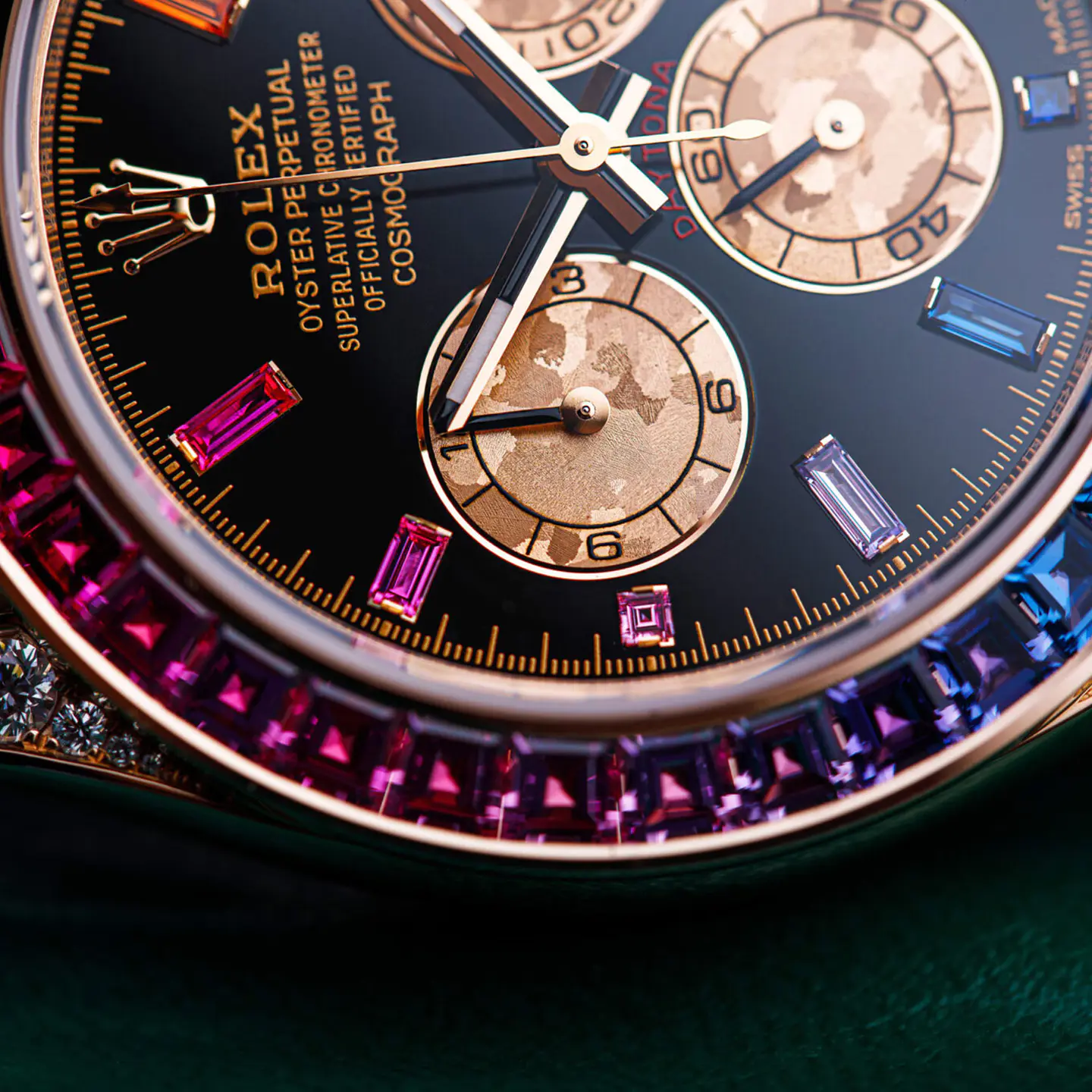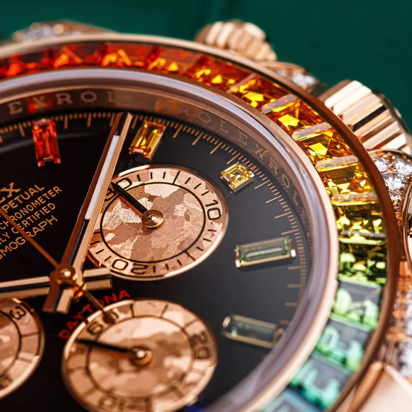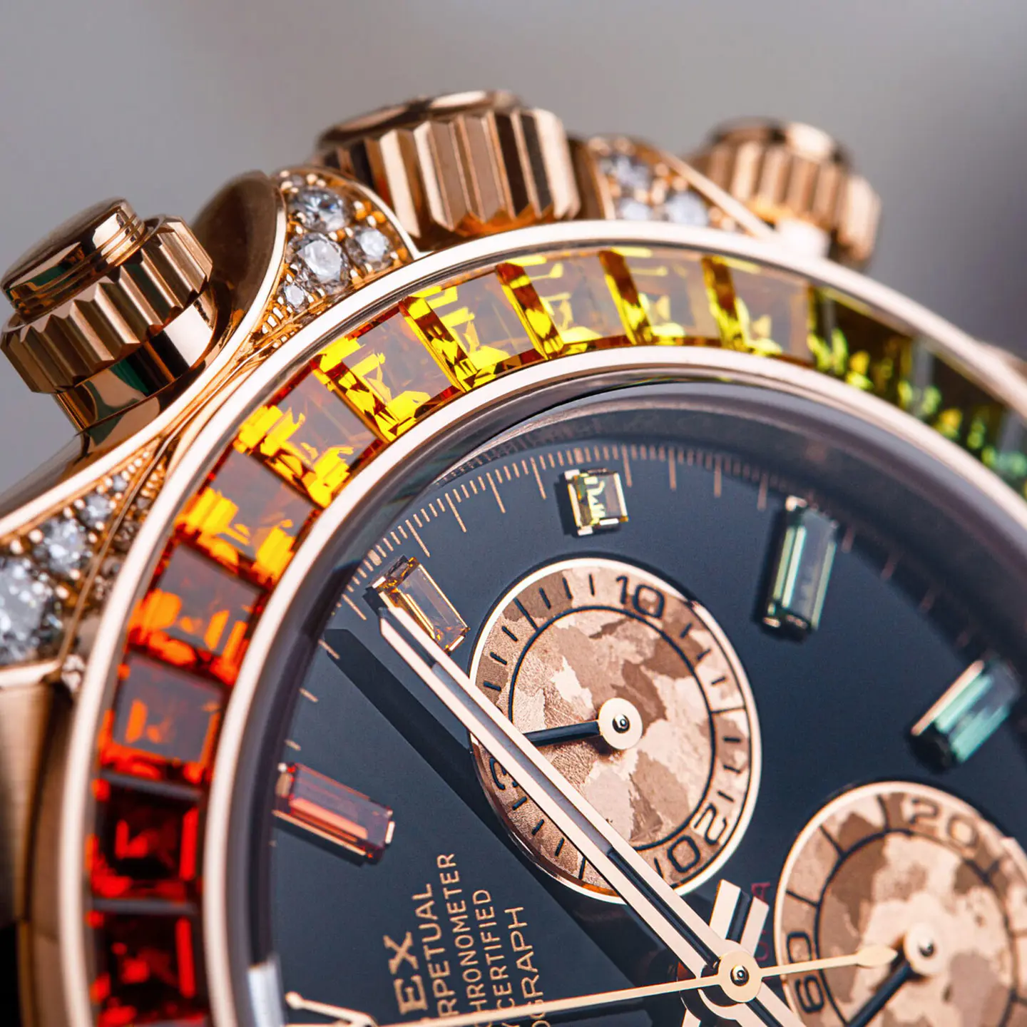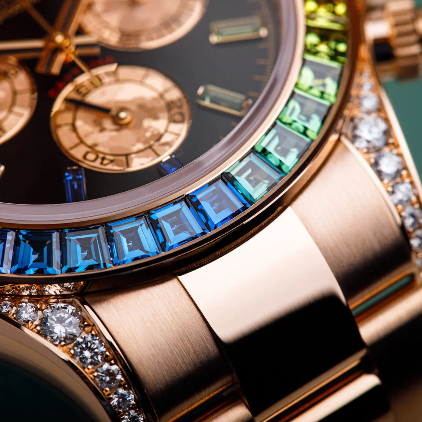 18kt rose gold case with a gold-tone 18kt rose gold bracelet. Fixed 36 baguette-cut sapphires bezel. Black dial with gold-tone hands and diamond hour markers.Dial Type: Analog. Chronograph - three sub-dials displaying: 60 second, 30 minute and 12 hour. Rolex Calibre 4130 automatic movement with a 72-hour power reserve. Scratch resistant sapphire crystal. Screw down crown. Solid case back. Round case shape. Case size: 40 mm. Water resistant at 100 meters / 330 feet. Functions: chronograph, hour, minute, small second, chronometer. Luxury watch style. Watch label: Swiss Made.
