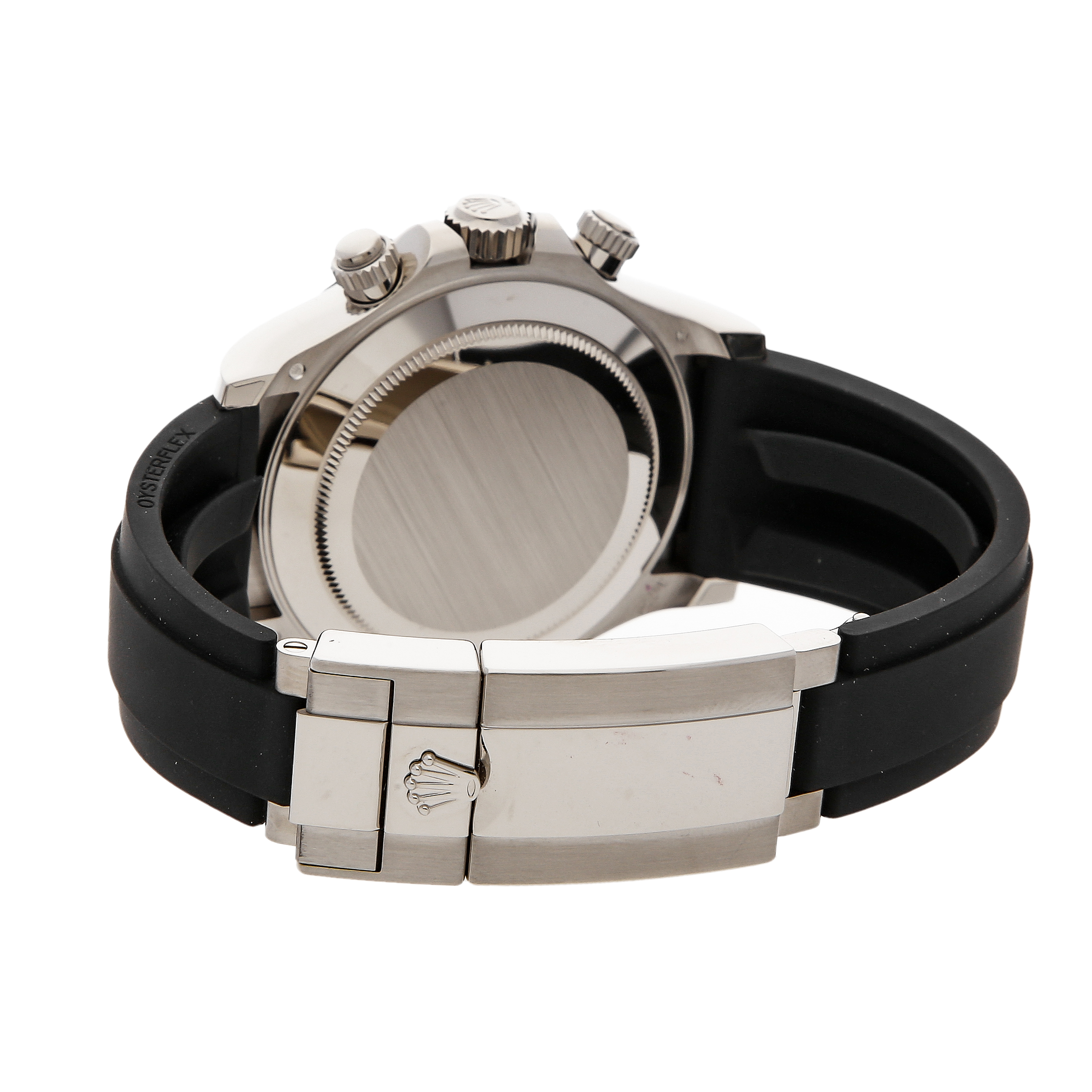 Pre-Owned Rolex Daytona Cosmograph (116519LN) self - winding automatic watch, features a 40mm 18k white gold case with a black Cerachrom bezel surrounding a black diamond dial on a black Oysterflex beacelet with an 18k white gold deployant buckle. Functions include hours, minutes, small seconds, chronograph and tachymeter.This watch comes complete with box and papers. Scattered Serial.Time remaining on the factory warranty!