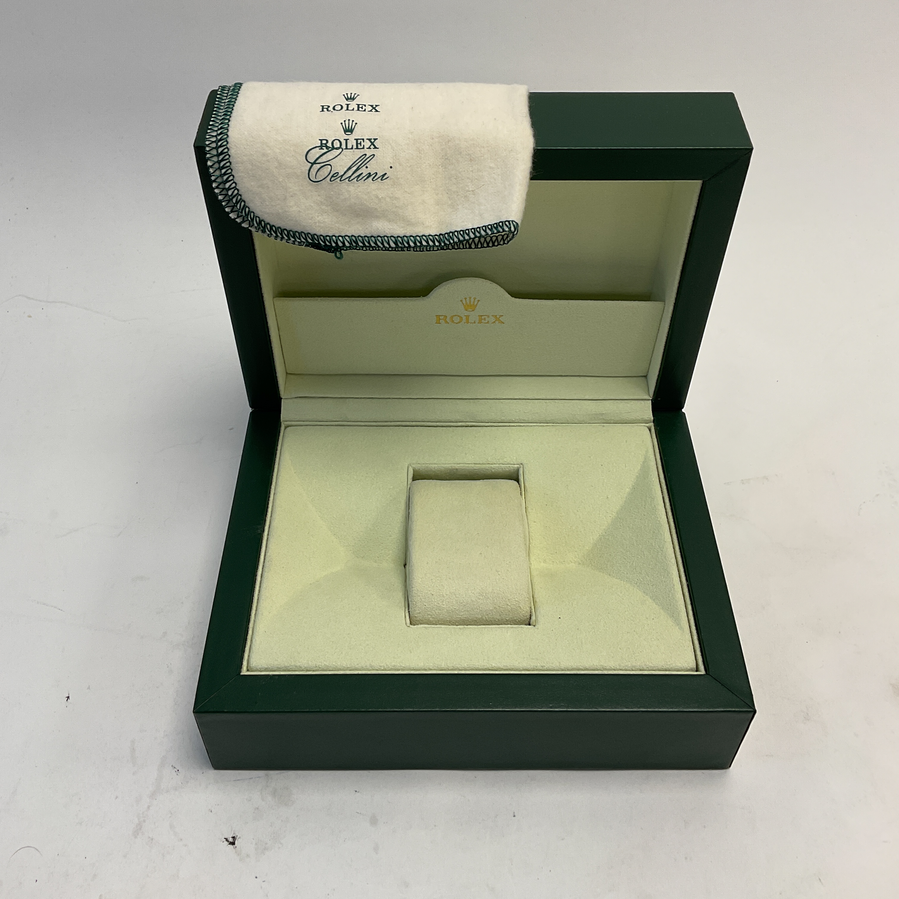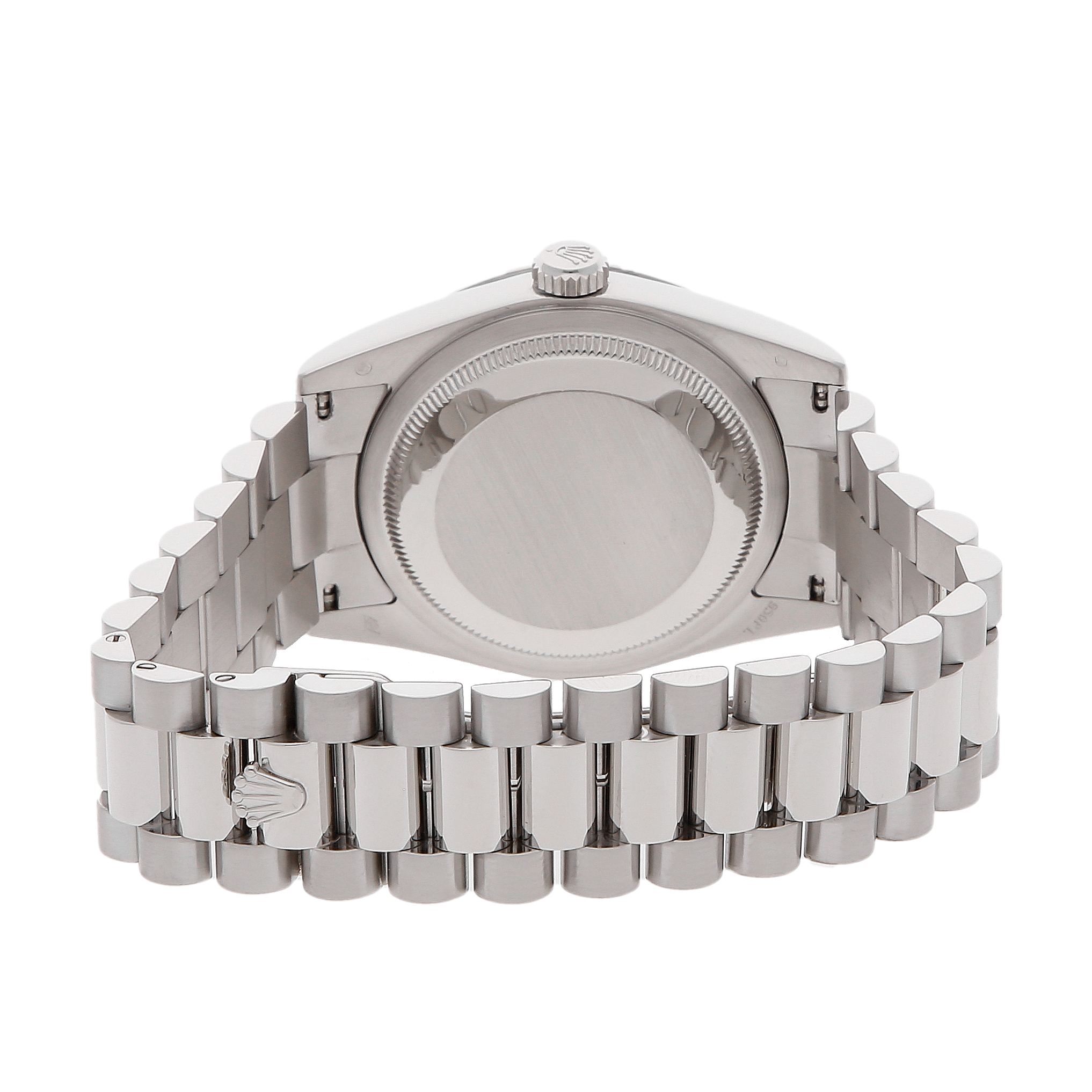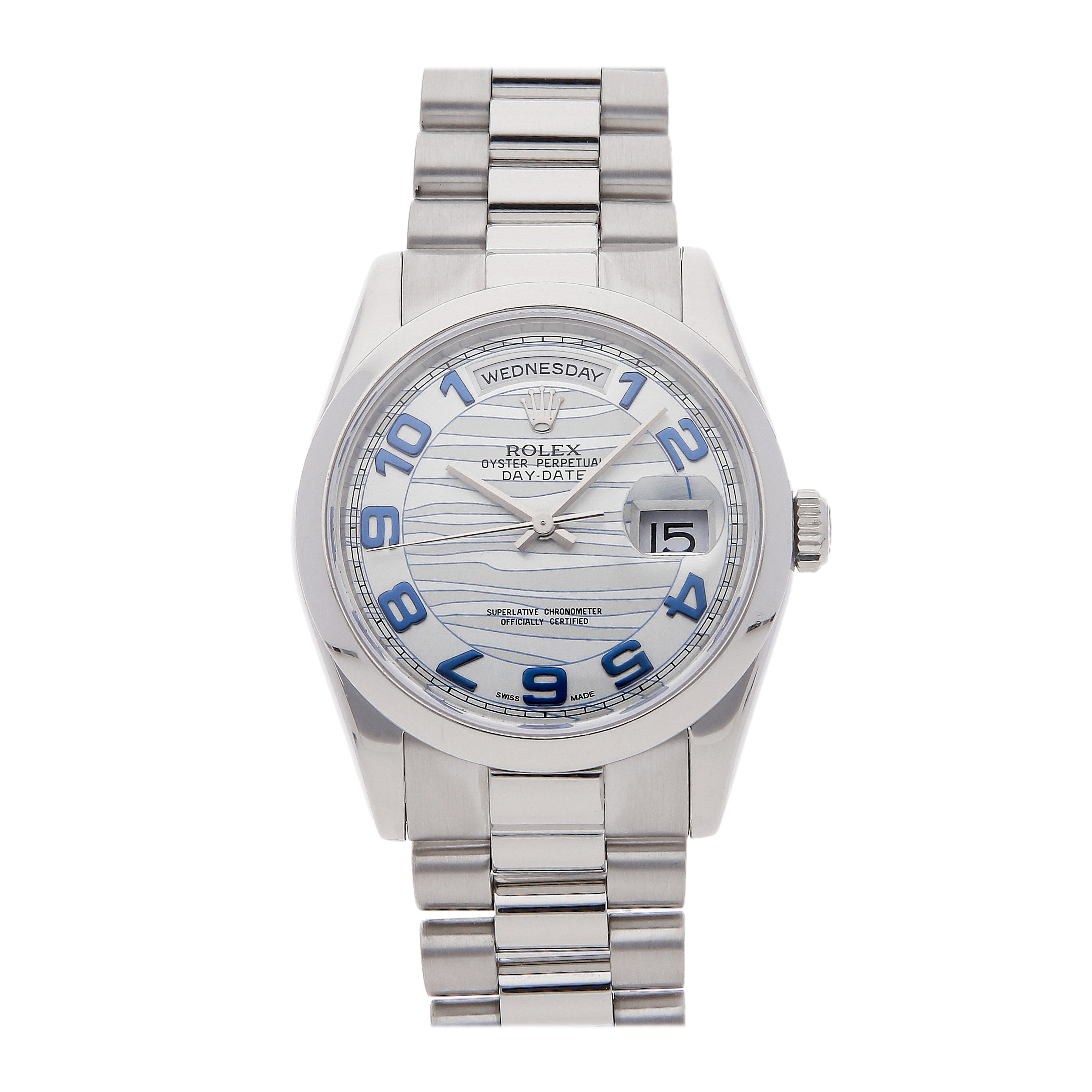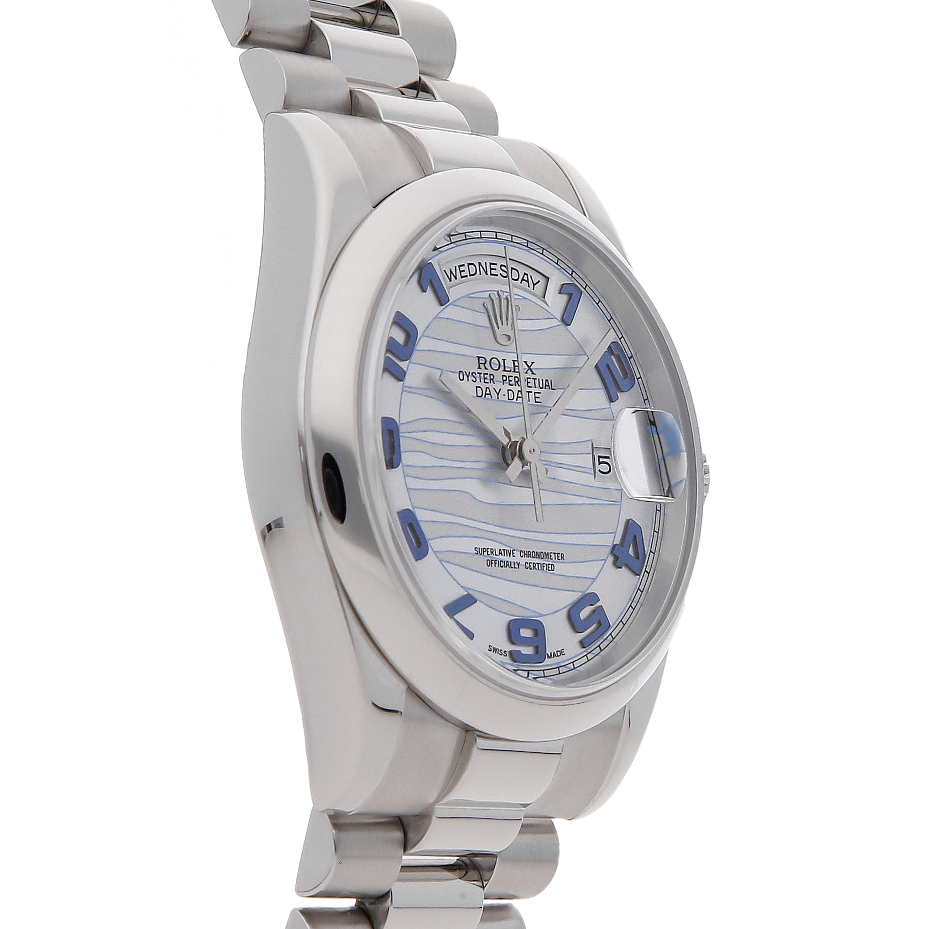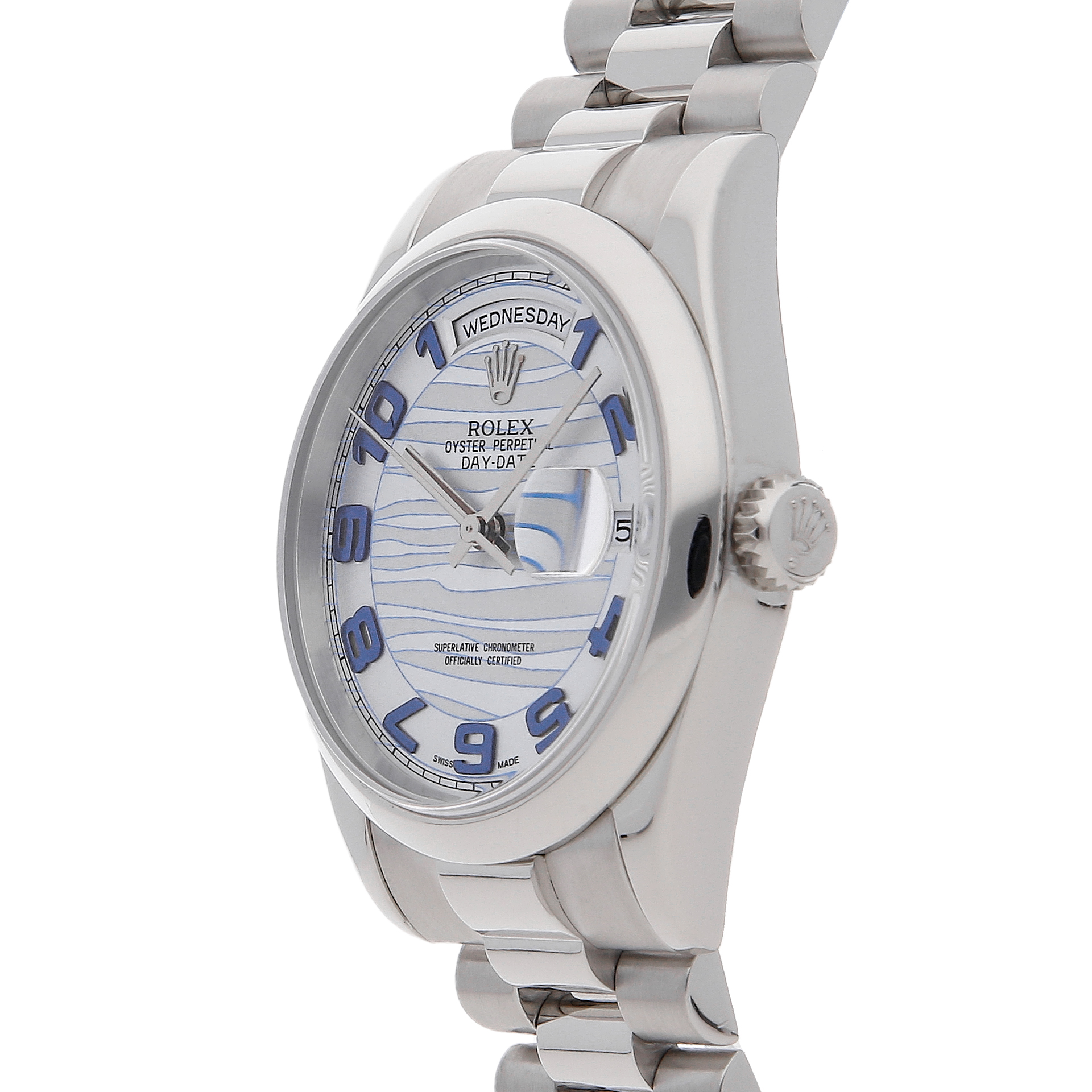 Pre-Owned Rolex Day-Date (118206) self-winding automatic watch, features a 36mm platinum case surrounding an ice blue wave dial on a platinum Presidential bracelet with folding buckle. Functions include hours, minutes, seconds, day and date.This watch has been serviced and comes with box. P Serial.Time remaining on the Manufacturer's service warranty!