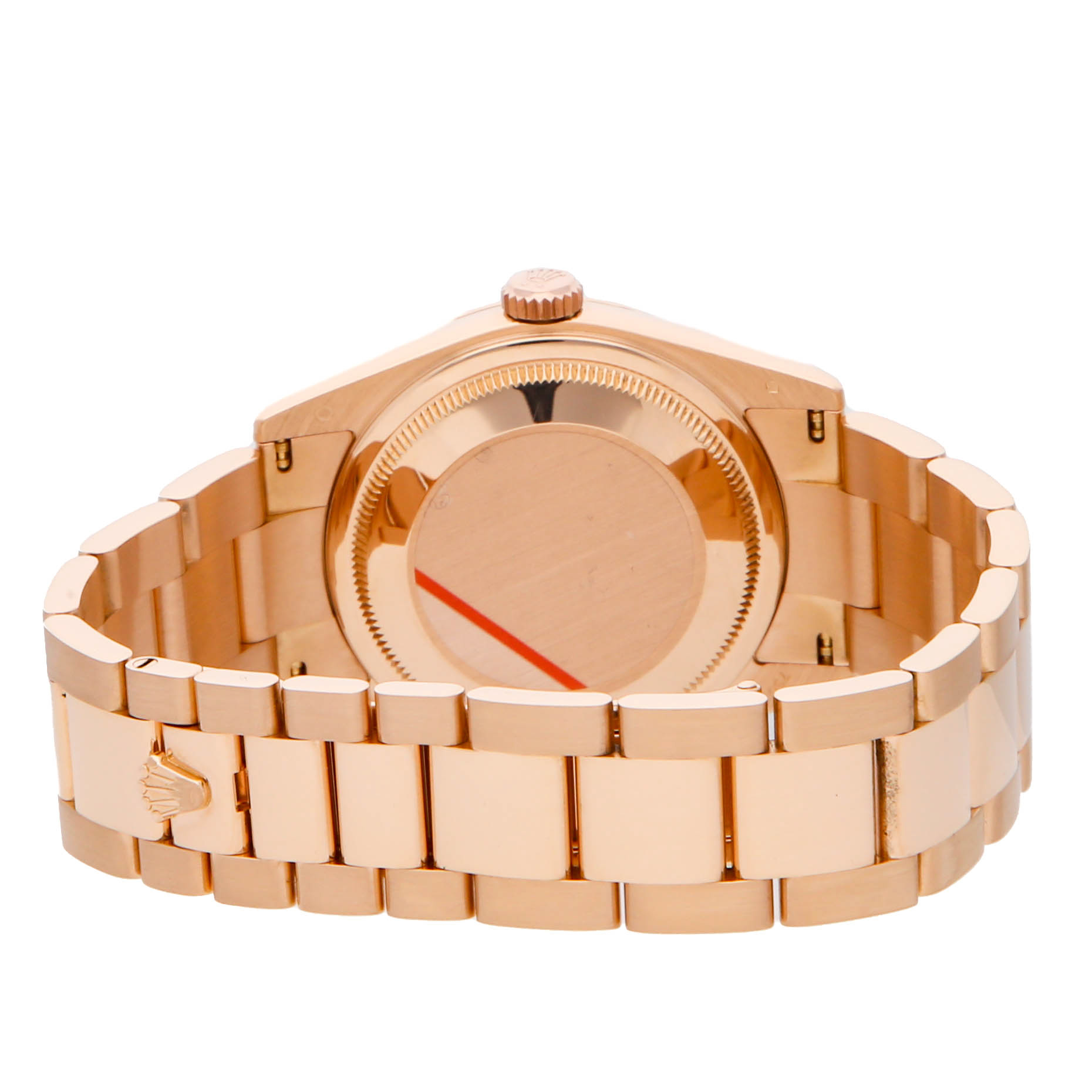 Pre-Owned Rolex Day-Date (118235F) self - winding automatic watch, features a 36mm 18k Everose gold case surrounding a white dial on an 18k Everose gold Oyster bracelet with folding buckle. Functions include hours, minutes, seconds, day and date. This watch comes with the original box and warranty. D Serial.We back this watch with a 2-Year WatchBox warranty!