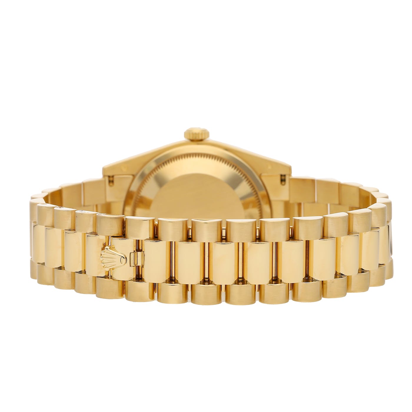 Pre-Owned Rolex Day-Date (118238) self - winding automatic watch, features a 36mm 18k yellow gold case surrounding a black dial on an 18k yellow gold President bracelet with folding buckle. Functions include hours, minutes, seconds, date and day. This watch comes with the original box. Scattered Serial. We back this watch with a 2-Year WatchBox warranty! This watch will be ready to ship in 5-7 days!
