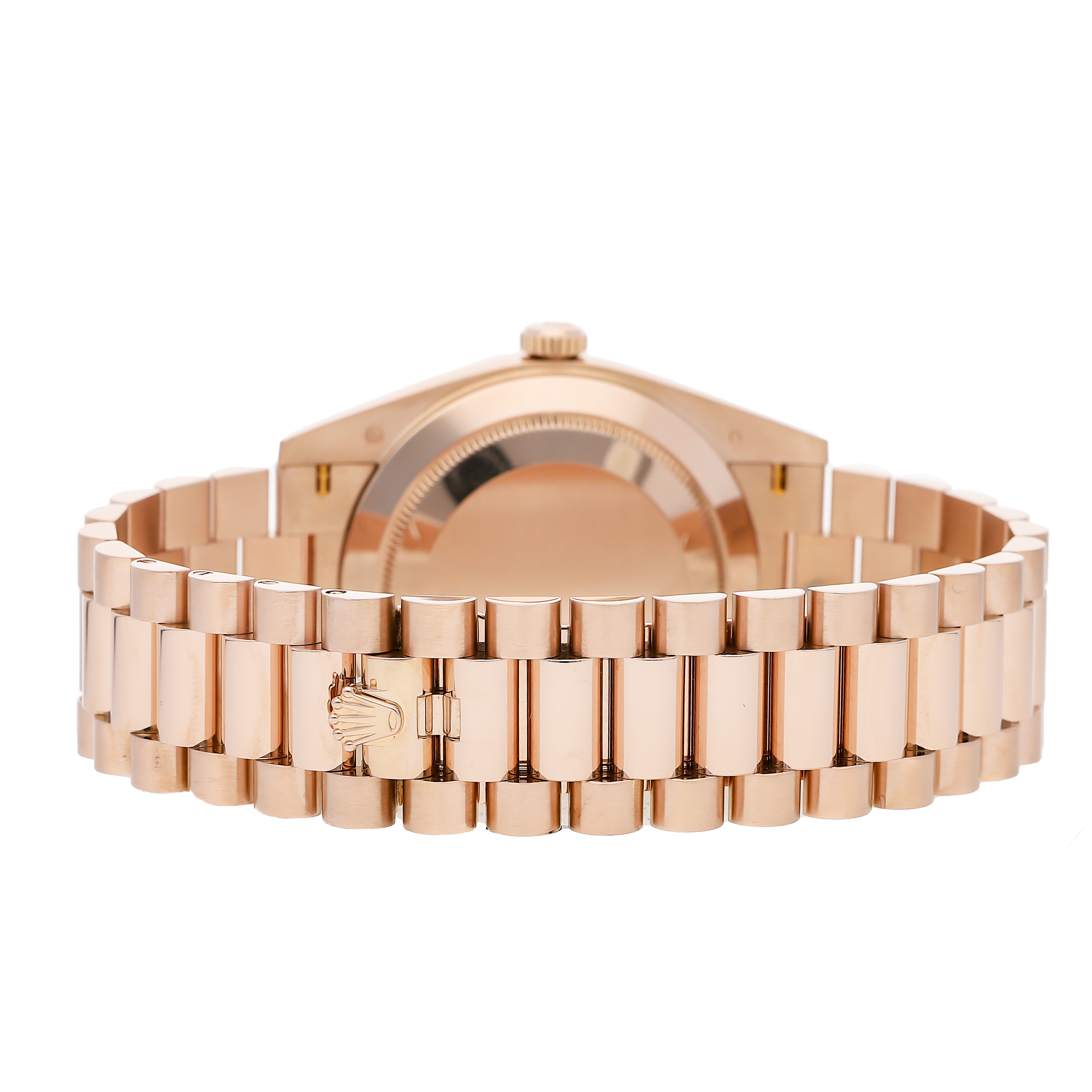 Pre-Owned Rolex Day-Date (228235) self - winding automatic watch, features a 40mm 18k Everose gold case surrounding a chocolate brown diagonal dial on an 18k Everose gold President btacelet with folding buckle. Functions include hours, minutes, seconds, date and day.This watch comes complete with the original box and papers. Scattered Serial.Time remaining on the factory warranty!This watch will be ready to ship in 5-7 days!