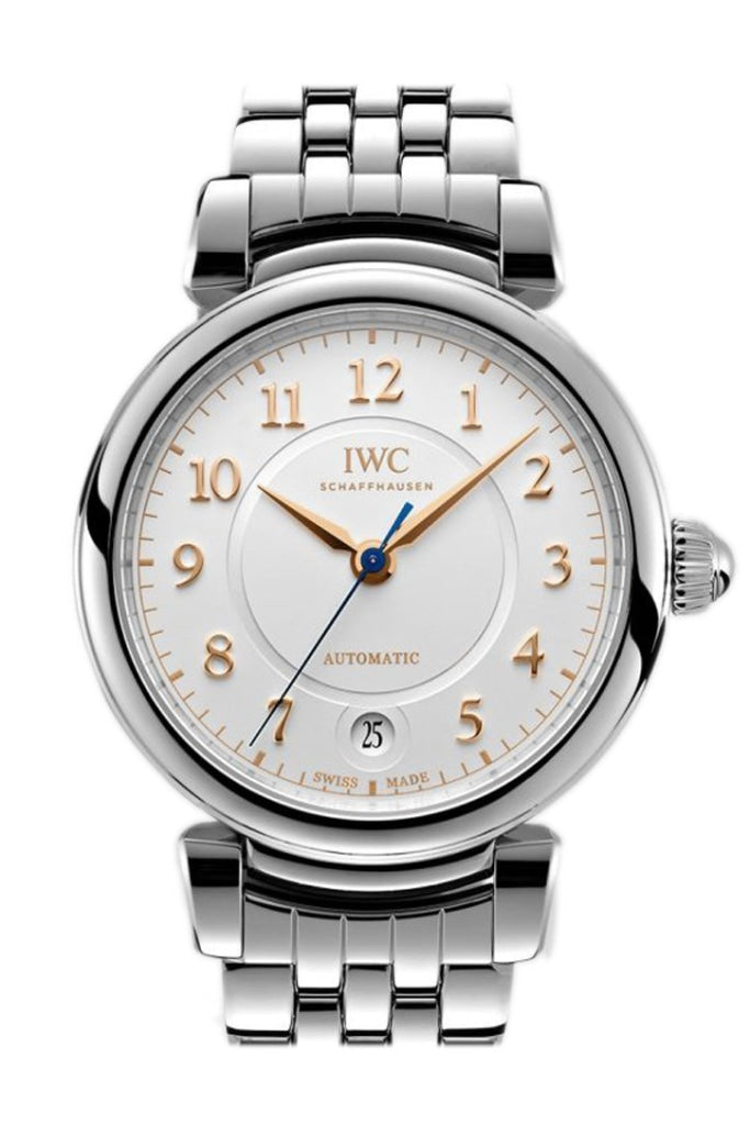 Silver-tone stainless steel case with a silver-tone stainless steel bracelet. Fixed silver-tone stainless steel bezel. Silver dial with rose gold-tone hands and Arabic numeral hour markers. Dial Type: Analog. Date display at the 6 o'clock position. IWC Calibre 35111 automatic movement with a 42-hour power reserve. Scratch resistant sapphire crystal. Skeleton transparent exhibition see through case back. Case size: 36 mm. Case thickness: 9.9 mm. Round case shape. Water resistant at 30 meters / 100 feet. Functions: date, hour, minute, second. Luxury watch style. Watch label: Swiss Made. IWC Da Vinci Silver Dial Automatic Mens Steel Watch IW458307