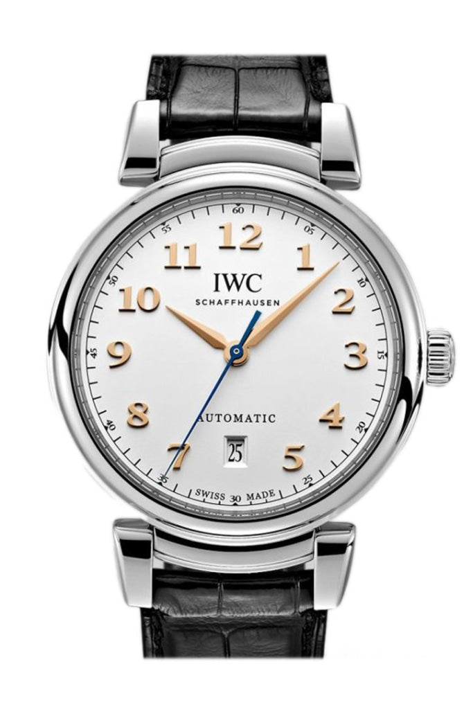 Silver-tone stainless steel case with a black alligator leather strap. Fixed silver-tone stainless steel bezel. Silver dial with rose gold-tone hands and Arabic numeral hour markers. Dial Type: Analog. Date display at the 6 o'clock position. IWC Calibre 35111 automatic movement with a 42-hour power reserve. Scratch resistant sapphire crystal. Case size: 40.4 mm. Case thickness: 10.2 mm. Round case shape. Buckle clasp. Water resistant at 30 meters / 100 feet. Functions: date, hour, minute, second. Luxury watch style. Watch label: Swiss Made. IWC Da Vinci Silver Dial Automatic Mens Leather Watch IW356601.