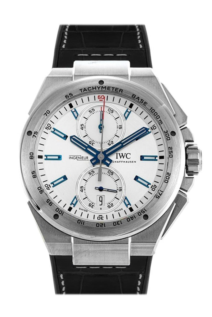 Stainless steel case with a blue leather strap. Fixed stainless steel bezel showing tachymeter markings. Silver dial with luminous blue hands and index hour markers. Minute markers around the outer rim. Dial Type: Analog. Luminescent hands and markers. Date display at the 6 o'clock position. Chronograph - two sub-dials displaying: 60 second and 60 minute. Automatic movement with 68 hour power reserve. Scratch resistant sapphire crystal. Screw down crown. Solid case back. Case diameter: 46 mm. Case thickness: 15 mm. Round case shape. Tang clasp. Water resistant at 120 meters / 400 feet. Functions: hours, minutes, seconds, date, flyback chronograph, stopwatch, hour and minute counters. Luxury watch style. Watch label: Swiss Made. IWC Ingenieur Chronograph Racer Silver Dial Rubber Strap Men's Watch IW378509