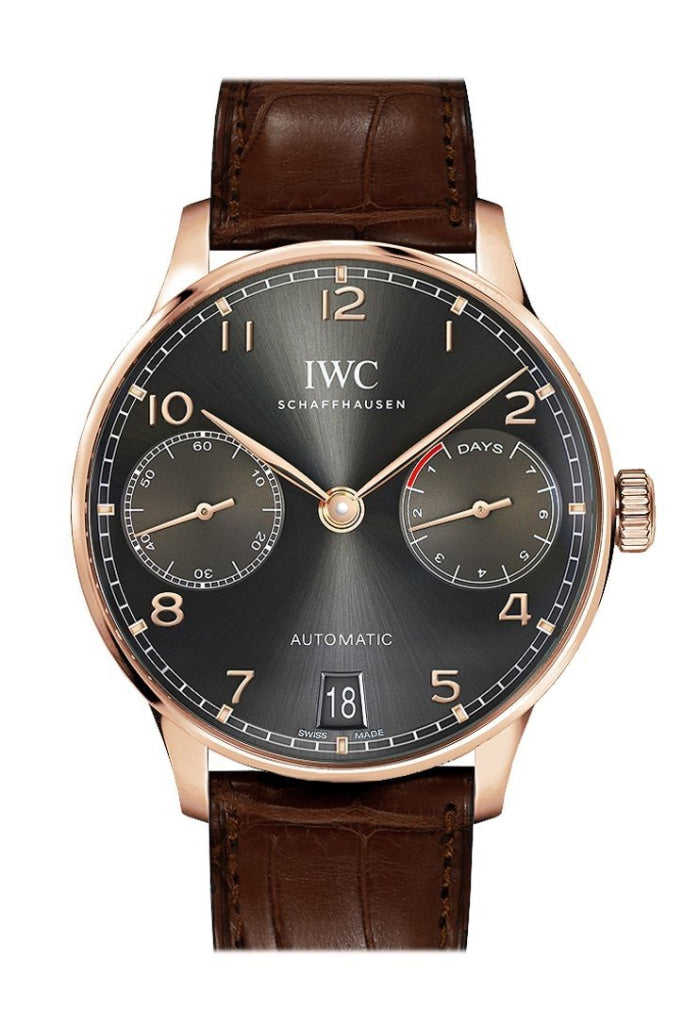 18k rose gold case with a brown alligator leather strap. Fixed bezel. Slate grey dial with rose gold-tone hands and Arabic numeral hour markers. Minute markers around the outer rim. Dial Type: Analog. Date display at the 6 o'clock position. Two - 60 second and power reserve. Automatic movement. Caliber 52010 engine. Scratch resistant sapphire crystal. Skeleton case back. Case diameter: 42.3 mm. Round case shape. Functions: date, hour, minute, second. Luxury watch style. Watch label: Swiss Made. IWC Portugeiser Slate Grey Dial 18K Rose Gold Automatic Mens Watch IW500702.