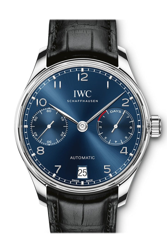 Silver-tone stainless steel case with a black (alligator) leather strap. Fixed silver-tone stainless steel bezel. Blue dial with silver-tone hands and Arabic numeral hour markers. Minute markers around the outer rim. Dial Type: Analog. Date display at the 6 o'clock position. Two - 60 second and power reserve subdials. IWC Calibre 52010 automatic movement with a 168-hour power reserve. Scratch resistant sapphire crystal. Pull / push crown. Transparent case back. Round case shape, case size: 42.3 mm, case thickness: 14.2 mm. Band width: 22 mm. Deployment with push button release clasp. Water resistant at 30 meters / 100 feet. Functions: date, hour, minute, second, power reserve. Luxury watch style. Watch label: Swiss Made. IWC Portugieser Automatic Blue Dial Mens Watch