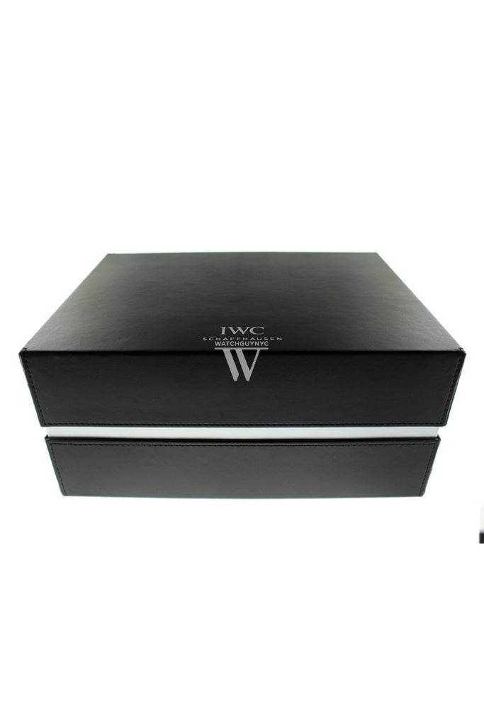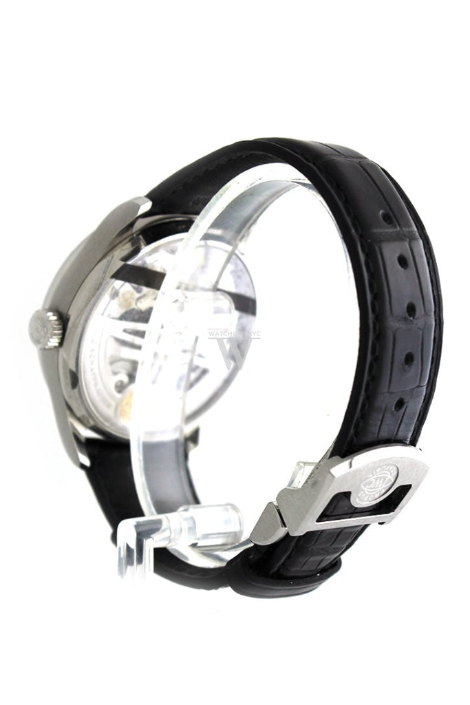 Stainless steel case with a black alligator leather strap. Fixed stainless steel bezel. Silver dial with blue hands and Arabic numeral hour markers. Minute markers around the outer rim. Dial Type: Analog. Date display at the 6 o'clock position. Two sub-dials displaying: 7 day power reserve and 60 second. Automatic movement with a 168-hour power reserve. Scratch resistant sapphire crystal. Push / pull crown. Skeleton case back. Case diameter: 42.3 mm. Case thickness: 14.5 mm. Round case shape. Fold over clasp with safety release. Water resistant at 30 meters / 100 feet. Functions: date, hour, minute, second. Luxury watch style. Watch label: Swiss Made. IWC Portugieser Automatic Black Strap Mens Watch