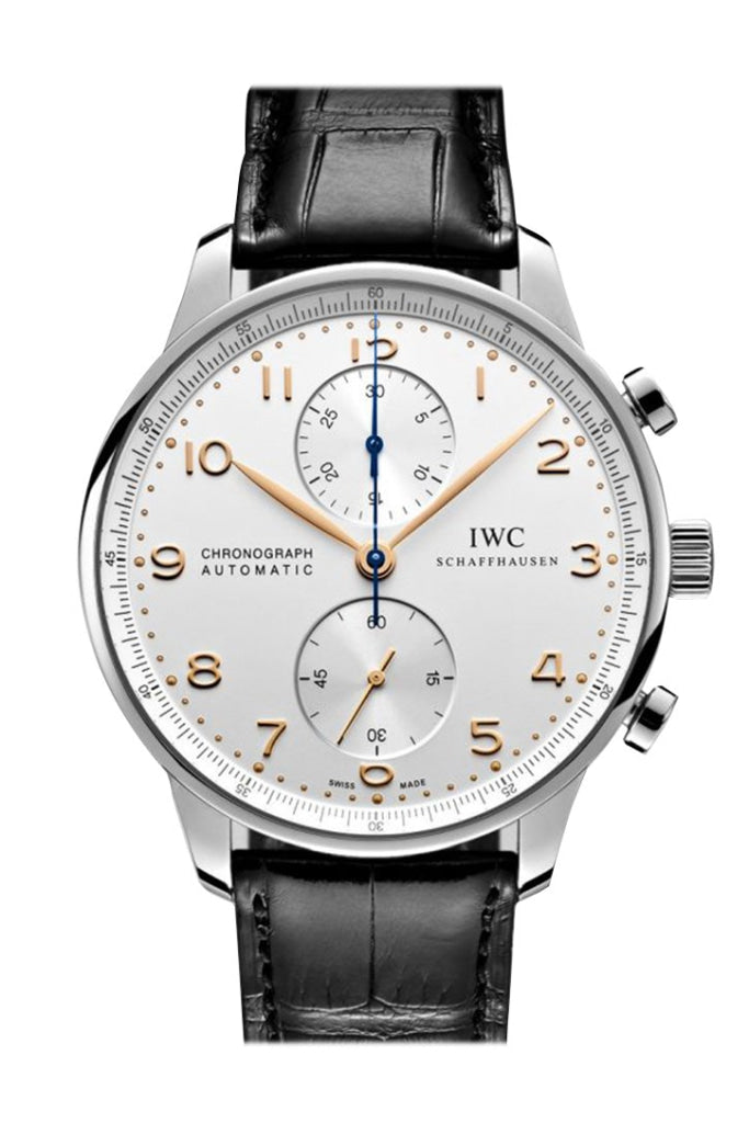 Stainless steel case with a black crocodile leather strap. Fixed stainless steel bezel. Silver dial with rose gold-tone hands and Arabic numeral hour markers. Minute markers around the outer rim. Dial Type: Analog. Chronograph - two sub-dials displaying: 30 minutes and 60 seconds. IWC calibre 79350 automatic movement with a 44-hour power reserve. Scratch resistant sapphire crystal. Pull / push crown. Solid case back. Case size: 40.9 mm. Case thickness: 12.3 mm. Round case shape. Band width: 20 mm. Deployment clasp. Water resistant at 30 meters / 100 feet. Functions: chronograph, hour, minute, second. Sport watch style