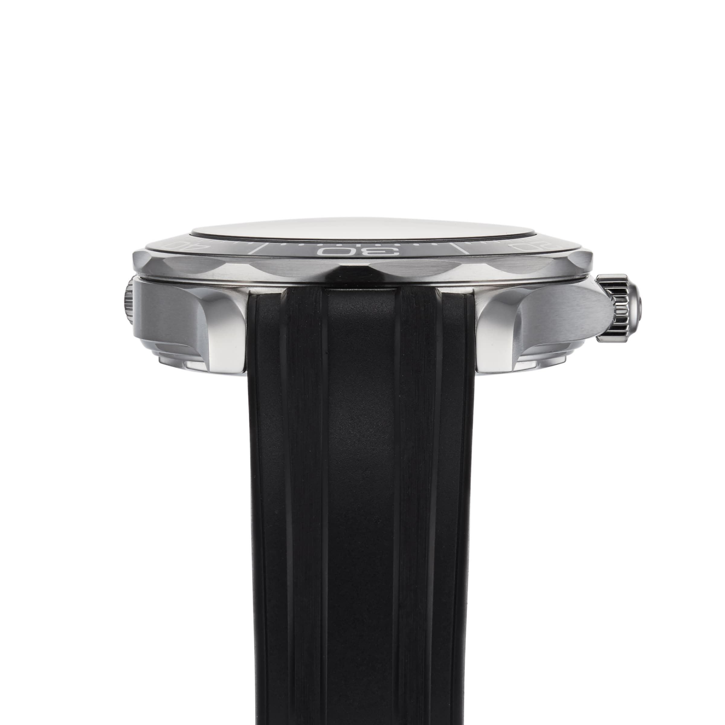 The watch is presented on a black rubber strap and is powered by the OMEGA Master Chronometer Calibre 8800, officially certified by METAS to resist magnetic fields up to 15,000 gauss. This beautiful, industry-leading movement can be viewed through the sapphire-crystal on the wave-edged caseback.
