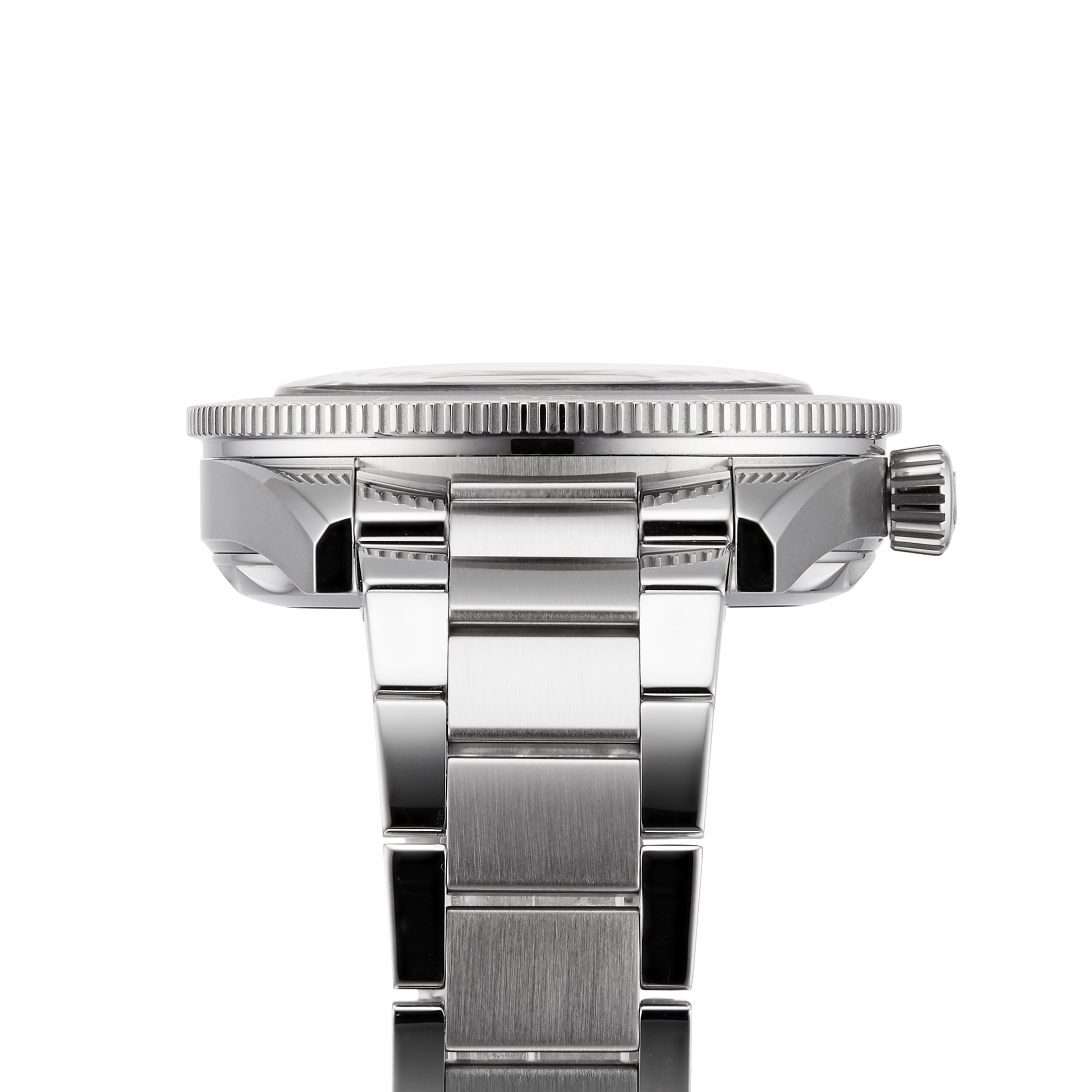This 41 mm stainless steel model features a black dial and oxalic anodized aluminium bezel with its diving scale filled with vintage Super-LumiNova. The recessed hour markers and open numerals feature Super-LumiNova, which is also present on the rhodium-plated hands.