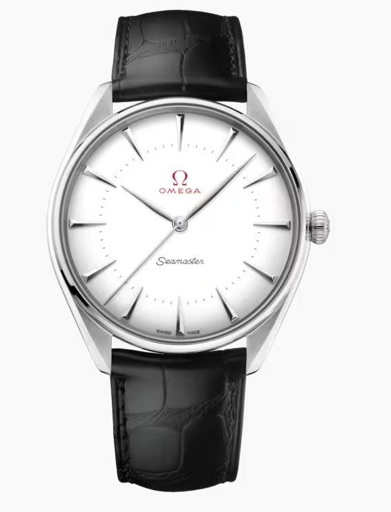 This 39.5 mm model has an 18K Canopus gold case and a black, leather strap. The domed dial is light, eggshell white enamel with a distinctive vintage OMEGA logo, minute track and Seamaster wording also in enamel. The leaf hands and applied indexes are 18K white gold.