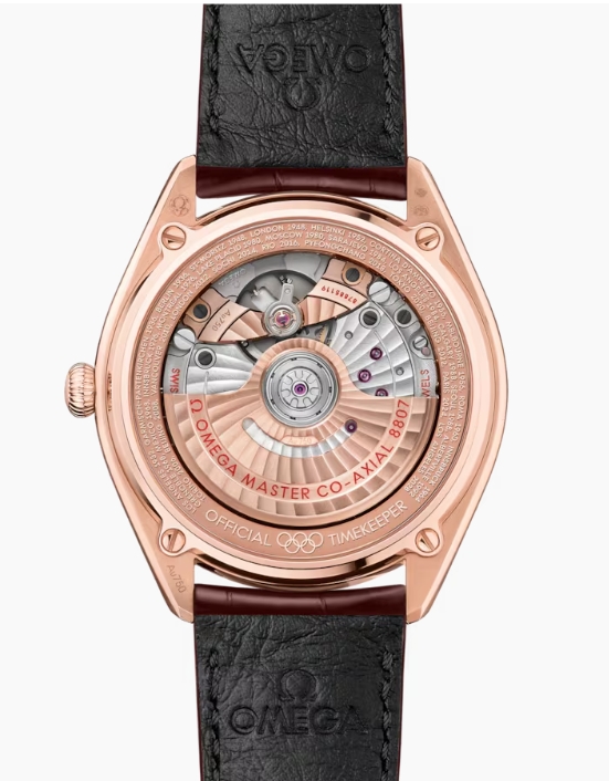 On the caseback, there is an 18K Sedna gold ring which includes all known host cities and dates from OMEGAs Olympic Games journey, from Los Angeles 1932 up to Los Angeles 2028.