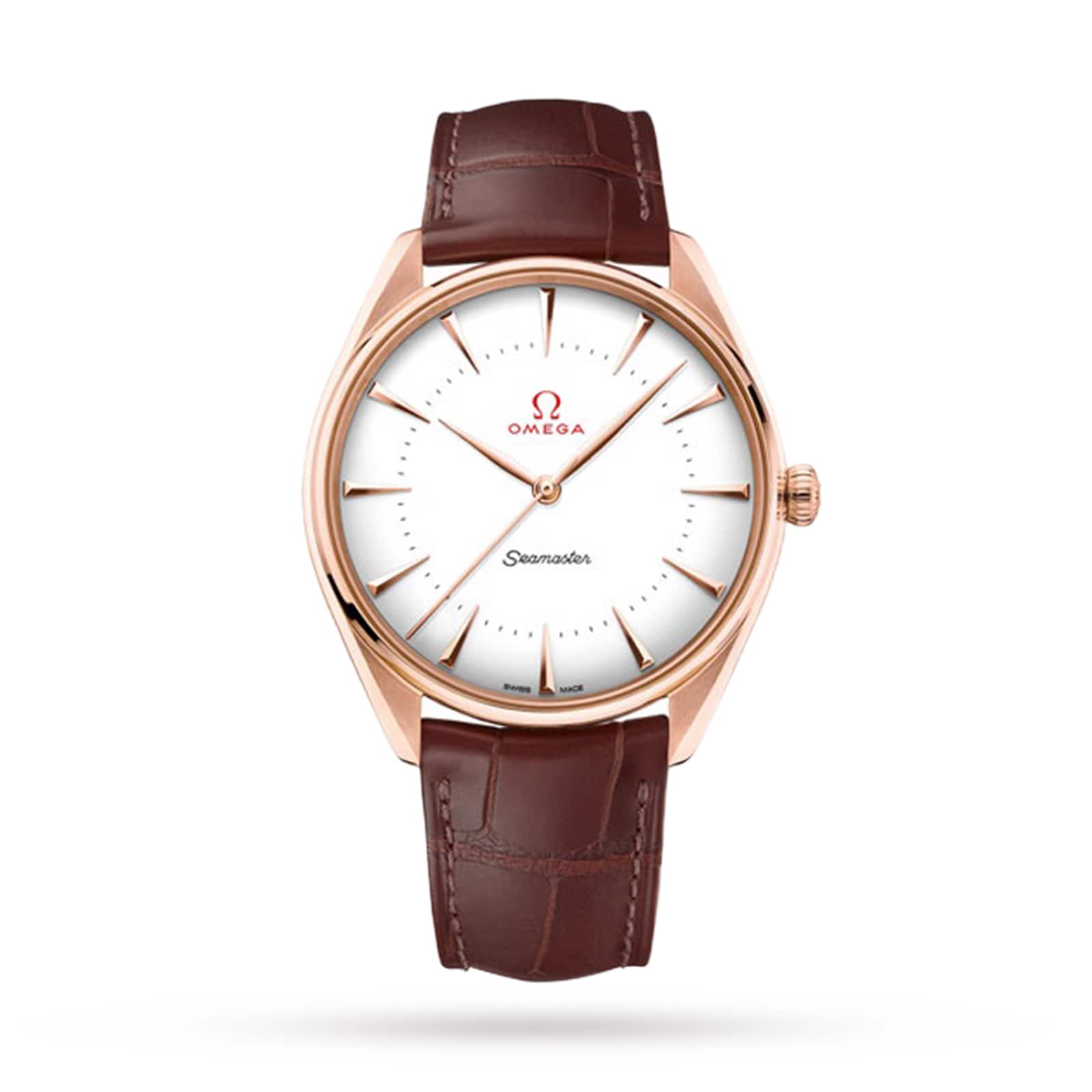 This 39.5 mm model has an 18K Sedna gold case and a brown, leather strap. The domed dial is light, eggshell white enamel with a distinctive vintage OMEGA logo, minute track and Seamaster wording also in enamel. The leaf hands and applied indexes are 18K Sedna gold.