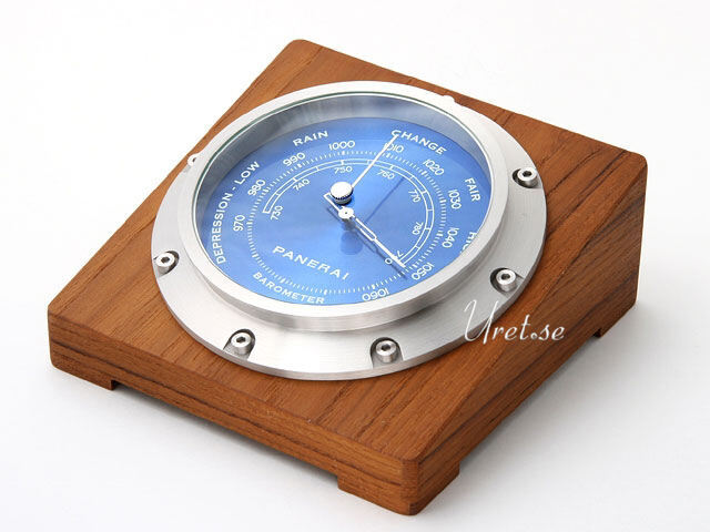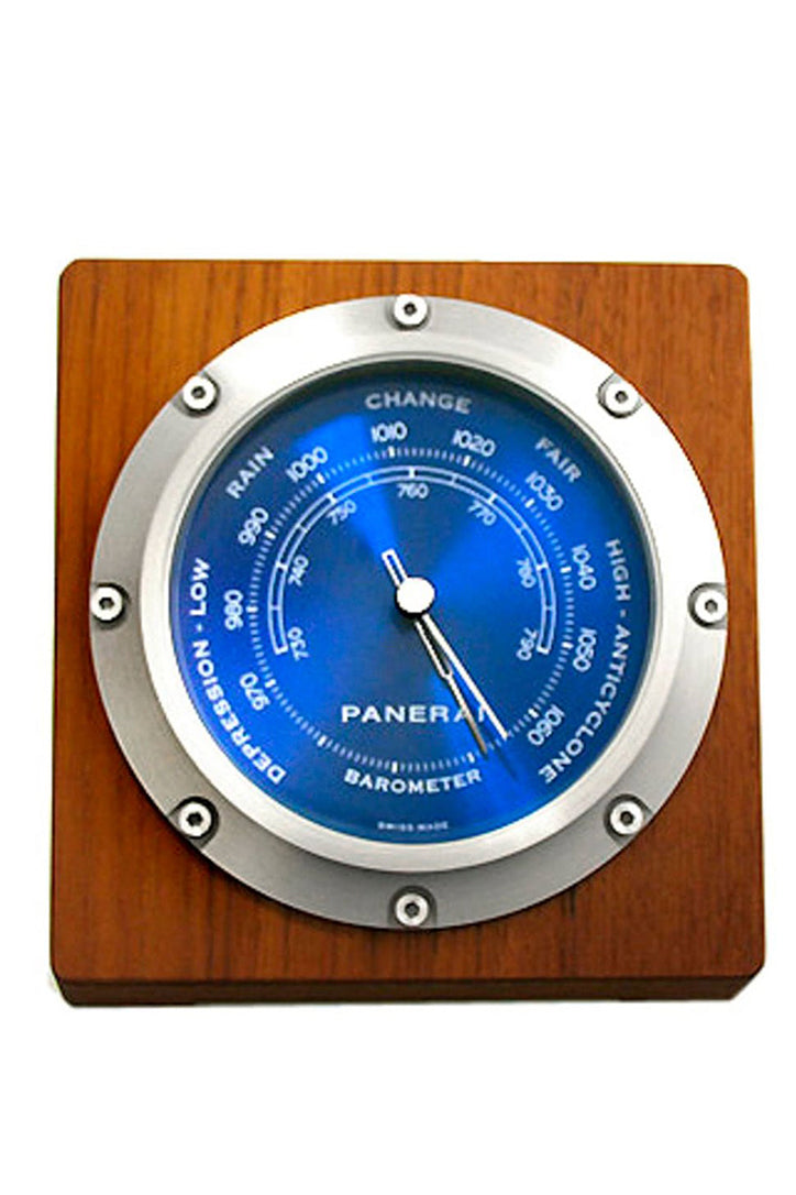 Wood case. Stainless steel bezel. Blue dial with silver-toned hands. Dial Type: Analog. Teak and brushed steel case back. Case diameter: 150 mm x 150 mm. Square case shape. Exposure to water/high humidity may cause severe damages. Functions: accurately measures atmospheric pressure. Luxury watch style. Panerai Blue Dial Wood and Stainless Steel Barometer