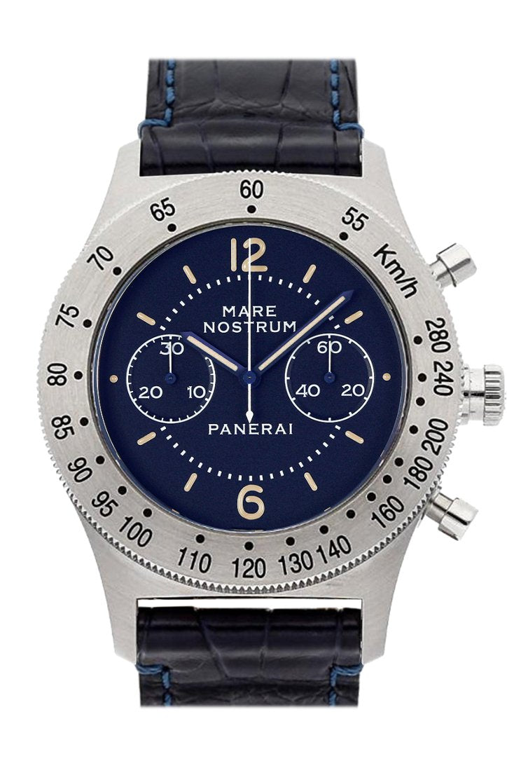Stainless steel case with a blue (alligator) leather strap. Fixed stainless steel bezel showing tachymeter markings. Blue dial with luminous blue hands and index hour markers. Arabic numerals mark the 6 and 12 o'clock positions. minute markers around an inner ring. Dial Type: Analog. Luminescent hands and markers. Chronograph - two sub-dials displaying: 60 second and 30 minute. Panerai calibre OP XXXIII hand wind movement with a 42-hour power reserve. Scratch resistant sapphire crystal. Pull / push crown. Solid case back. Round case shape. Case size: 42 mm. Band width: 22 mm / 22 mm. Tang clasp. Water resistant at 50 meters / 165 feet. Functions: chronograph, tachymeter, hour, minute, second. Additional Info: limited edition of 1000 pieces. Luxury watch style. Watch label: Swiss Made. Panerai Mare Nostrum Acciaio Chronograph Blue Dial Mens Watch PAM00716