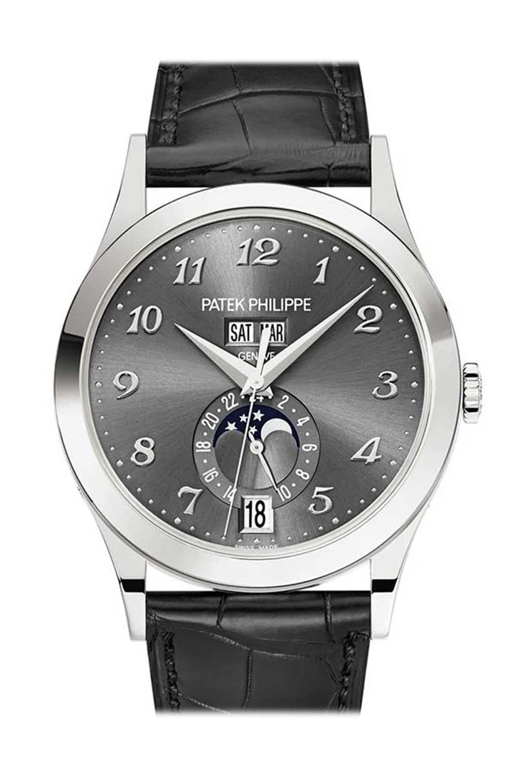 18kt white gold case with a black (alligator) leather strap. Fixed 18kt white gold bezel. Charcoal grey sunburst dial with silver-tone hands and Arabic numeral hour markers. Minute markers around the outer rim. Dial Type: Analog. Date display at the 6 o'clock position. Day of the week and month display above center dial. Combination 24 hours / moonphase sub-dial. Patek Philippe calibre 324 S QA LU 24H/303 automatic movement with a 45-hour power reserve. Scratch resistant sapphire crystal. Transparent case back. Round case shape. Case size: 38.5 mm. Case thickness: 11 mm. Band width: 21 mm. Deployment clasp. Water resistant at 30 meters / 100 feet. Functions: date, day, hour, minute, second, month, moonphase, annual calendar. Additional Info: unsuitable for any contact with water whatsoever. Luxury watch style. Watch label: Swiss Made. Patek Philippe Complications Automatic Annual Calendar Mens Watch 5396G-0145396G