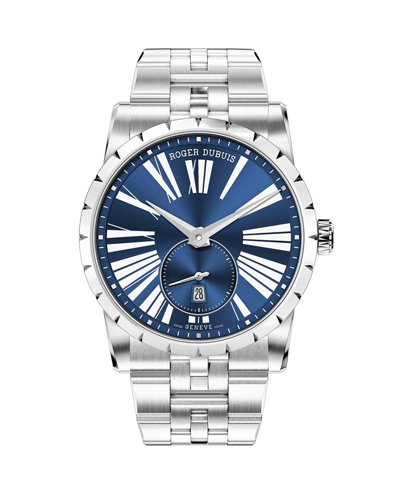 ["Excalibur Essential - Automatic small seconds RD830 caliber - 316L stainless steel case - 42mm - 316L stainless steel bracelet - blue dial\r\nRoger Dubuis Automatic movement RD830 with small seconds, date and 22K pink gold oscillating weight. This Timepiece is the perfect match between timeless sophistication and modernity. \r\nManufactured in 316L stainless steel, this 42mm timepiece is the timeless and elegant choice that will suit any occasion."]