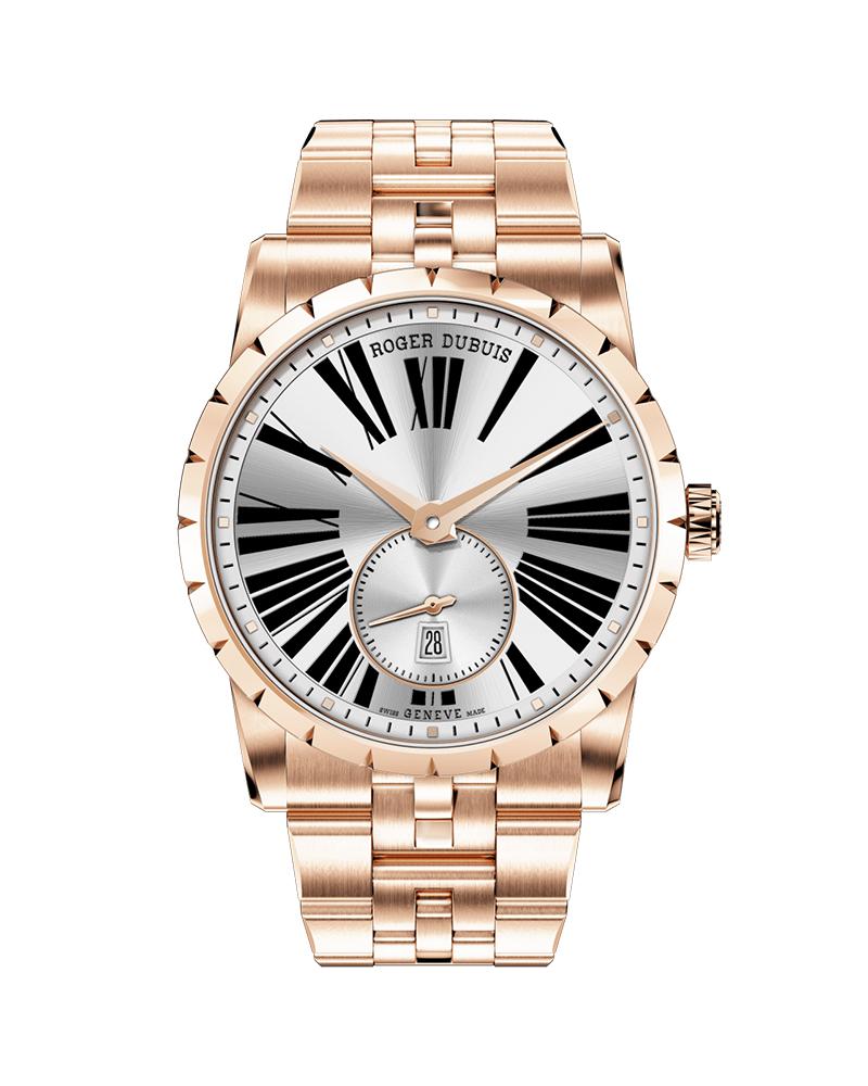 ["Excalibur Essential - Automatic small seconds RD830 caliber - 18K pink gold case - 42mm - 18K pink gold bracelet\r\nRoger Dubuis Automatic movement RD830 with small seconds, date and 22K pink gold oscillating weight. \r\nManufactured in 18K pink gold, this 42mm timepiece is the timeless and elegant choice that will suit any occasion."]