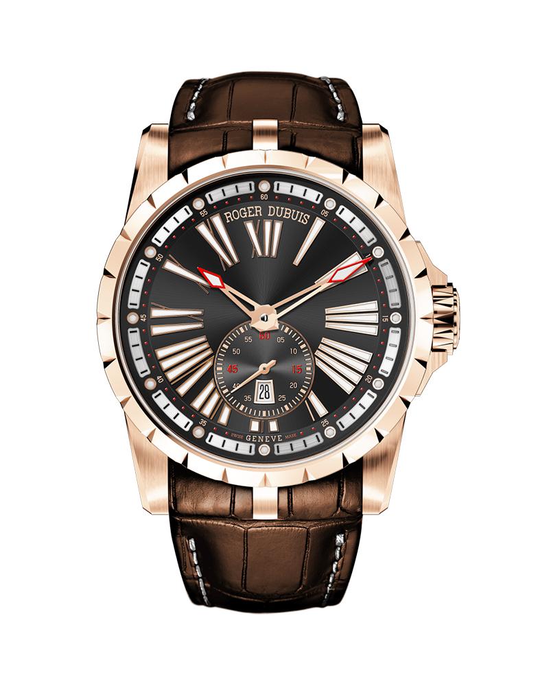 ["Excalibur Essential - Automatic small seconds RD830 caliber - 18K pink gold case - 45mm - Leather strap - Anthracite and brown\r\nAUTOMATIC RD830 SERIES: Exclusive Roger Dubuis Automatic movement RD830 with small seconds, date and a circular oscillating weight.\r\nDisplayed in 18K pink gold, the timepiece is an elegant and timeless value full of Roger Dubuis' subtle extravagance. This Timepiece is also remarkable as it houses a RD830 automatic caliber with a titanium oscillating weight."]