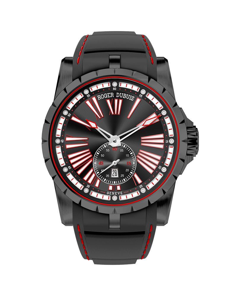 ["Excalibur Essential - Automatic small seconds RD830 caliber - titanium black DLC case - 45mm - Rubber strap - Black and redrn AUTOMATIC RD830 SERIES: Exclusive Roger Dubuis Automatic movement RD830 with small seconds, date and a circular oscillating weight.rnDisplayed in titanium black DLC, the timepiece is as light as comfortable to wear, titanium being 4 times lighter than gold. This Timepiece is also remarkable as it houses a RD830 automatic caliber with a titanium oscillating weight"]