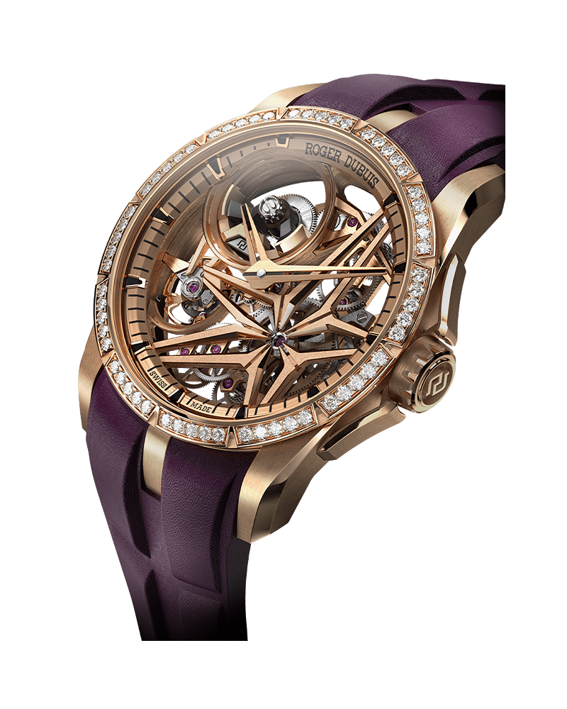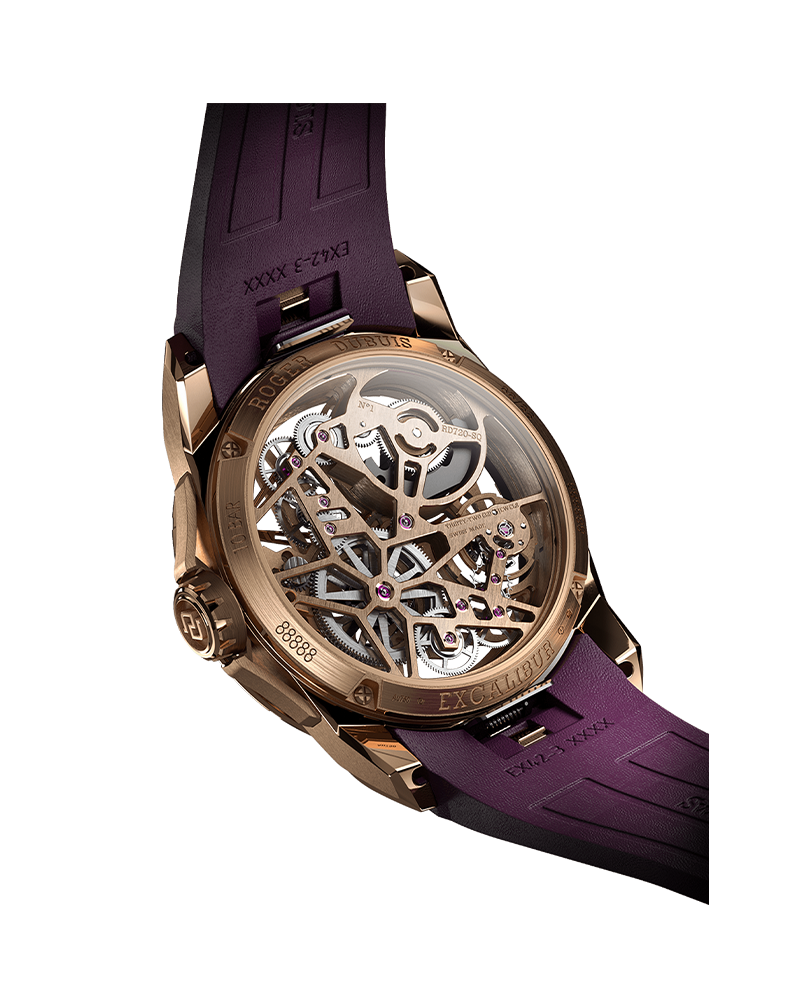 The skeleton calibres manufactured by Roger Dubuis in Geneva are the essence of the expressive singularity of the Excalibur collection. Complying with one of the most respected certifications of Haute Horlogerie, the Poin on de Gen ve, the Excalibur watches are designed like contemporary works of art. Every single component being finished by hand, the watches are symbols of passion. The work of hyper-skilled craftsmen is at the forefront of each watch with a direct view on the creative mechanics making these pieces more alive than ever.MOVEMENT- Energy: Automatic, self-winding Indications: Hour - Minute, Power reserve: 72 Hours, CASE - Pink gold case with sapphire crystal with anti-reflective coating Pink gold open case back with sapphire crystal.Size: 42mm, Water Resistance: 10 bar (100 m). DIAL - Pink gold plated double surface flange with engraved minute track and transferred texts, polished and black hour markers with SLN in the center. Main material: Pink Gold 18K.STRAP- According our non-exotic policy, Excalibur collection is adorned with a premium Purple leather strap, built in volume to follow the design of the case and the movement. The strap is interchangeable thanks to Quick Release System. CLASP- Pink gold cover with steel blades, triple folding, interchangeable with Quick Release System - QRS, Type: Pink Gold 18K