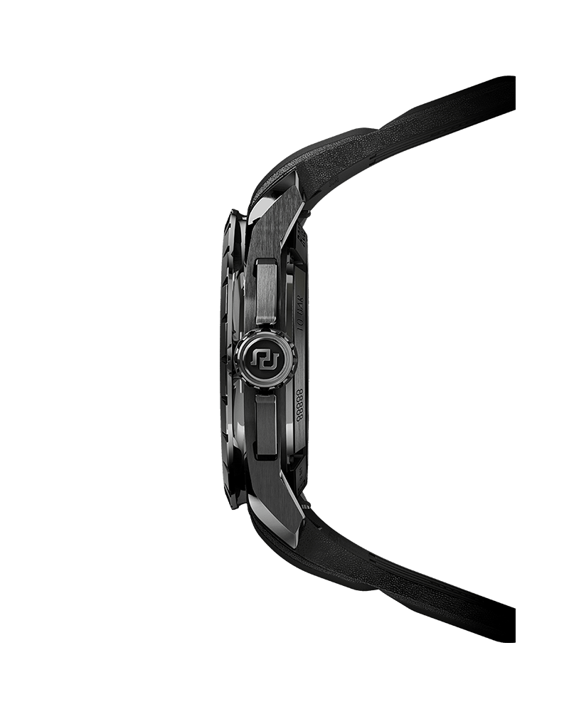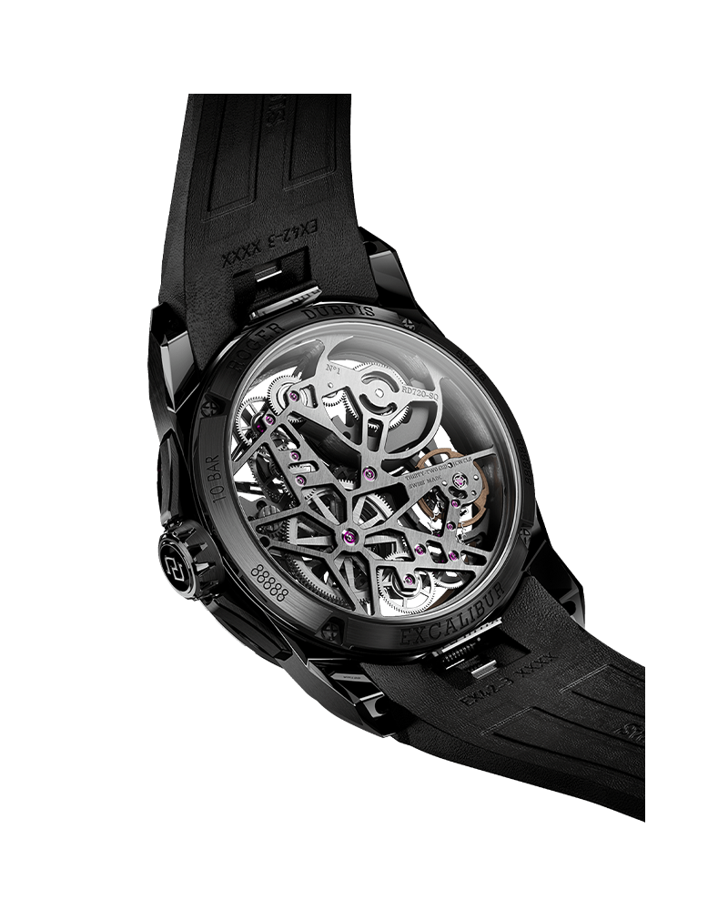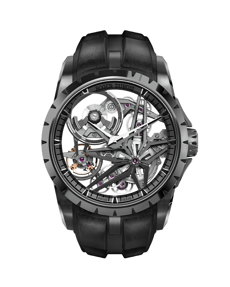The skeleton calibres manufactured by Roger Dubuis in Geneva are the essence of the expressive singularity of the Excalibur collection. Complying with one of the most respected certifications of Haute Horlogerie, the Poin on de Gen ve, the Excalibur watches are designed like contemporary works of art. Every single component being finished by hand, the watches are symbols of passion. The work of hyper-skilled craftsmen is at the forefront of each watch with a direct view on the creative mechanics making these pieces more alive than ever. CASE-Ceramic case Ceramic bezel Ceramic crown Sapphire crystal with anti-reflective coating Titanium DLC open case back with sapphire crystal Size: 42mm, Water Resistance: 10 bar (100 m),DIAL Black double surface flange with engraved minute track and transferred texts, polished and Grey hour markers with SLN in the center Main material: Ceramic STRAP According our non-exotic policy, Excalibur collection is adorned with a premium calf leather strap, built in volume to follow the design of the case and the movement. The strap is interchangeable thanks to Quick Release System. Black Leather CLASP Black DLC triple folding buckle interchangeable with Quick Release System - QRS Type: Titanium, MOVEMENT-Energy: Automatic, self-winding Indications: Hour - Minute Power reserve: 72 Hours