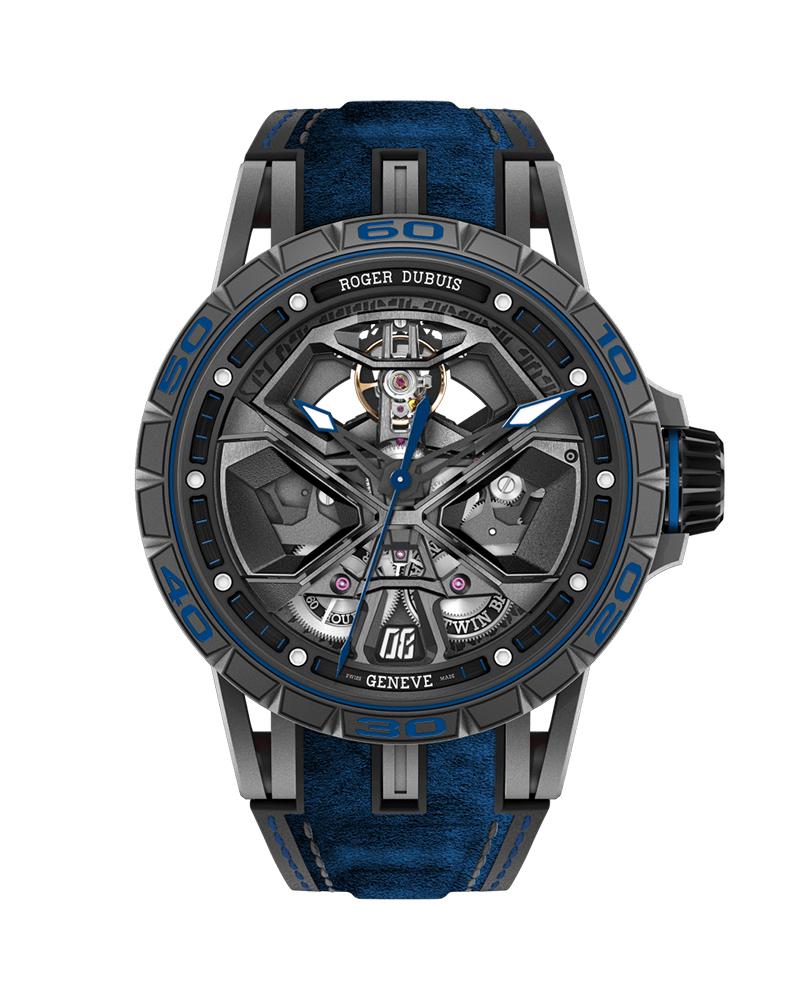 [Excalibur Huracan - Skeleton 12 balance RD630 caliber - Ti DLC skeleton case - 45mm - Bi-material strap - rubber and Alcantara\r\nSkeleton 12 balance. Highly technical and designed watchmaking inspired by the automotive world.\r\nThe new engine of Roger Dubuis directly inspired from the automotive world and specifically co-developed with our partner Lamborghini.\r\nThe second calibre co-developped specifically for the partnership with Lamborghini. This new engine offers a 12 angle balance escapement with an automatic winding mechanism displaying a rim-like rotor. The upper calibre features a strut-bar designed bridge recalling the ones of the V10 engine of the Lamborghini Huracan.]