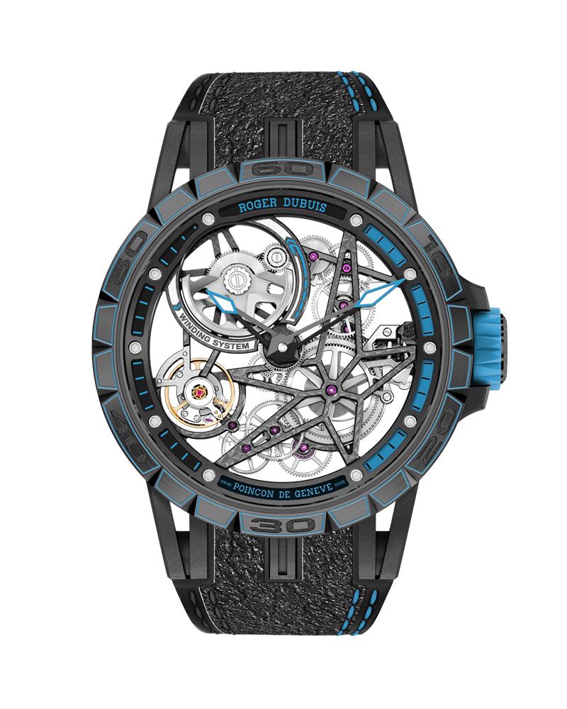["Excalibur Spider Pirelli - Skeleton automatic RD820SQ caliber - titanium black DLC skeleton case - 45mm - Bi-material strap - blue Pirelli editionrnExclusive partnership with Pirelli: world pioneer in technical and industrial innovations and sole supplier of premium tyres to the world s flagship motorsports competitions. Playing with the famous color codes of Pirelli, the surprise comes from the strap featuring rubber inlays from certified Pirelli winning tyres having competed in real races D and adorned with legendary tread motifs reproducing the profile of a Pirelli CinturatoT intermediate tyre. The robust 45mm skeleton case with its black DLC titanium elements and contrasting with Pirelli mythical tyres colors touches provides a perfect frame for Calibre RD820SQ. The design and height of the famous Roger Dubuis micro-rotor effectively enhance the spectacular 3D effect favoured by the Manufacture, as does the raised position of the Astral Skeleton. As well as enjoying the key Pirelli signature characteristics linking their high-octane timepieces with a landmark motorsports victory, lucky owners of this 88-piece limited edition."]