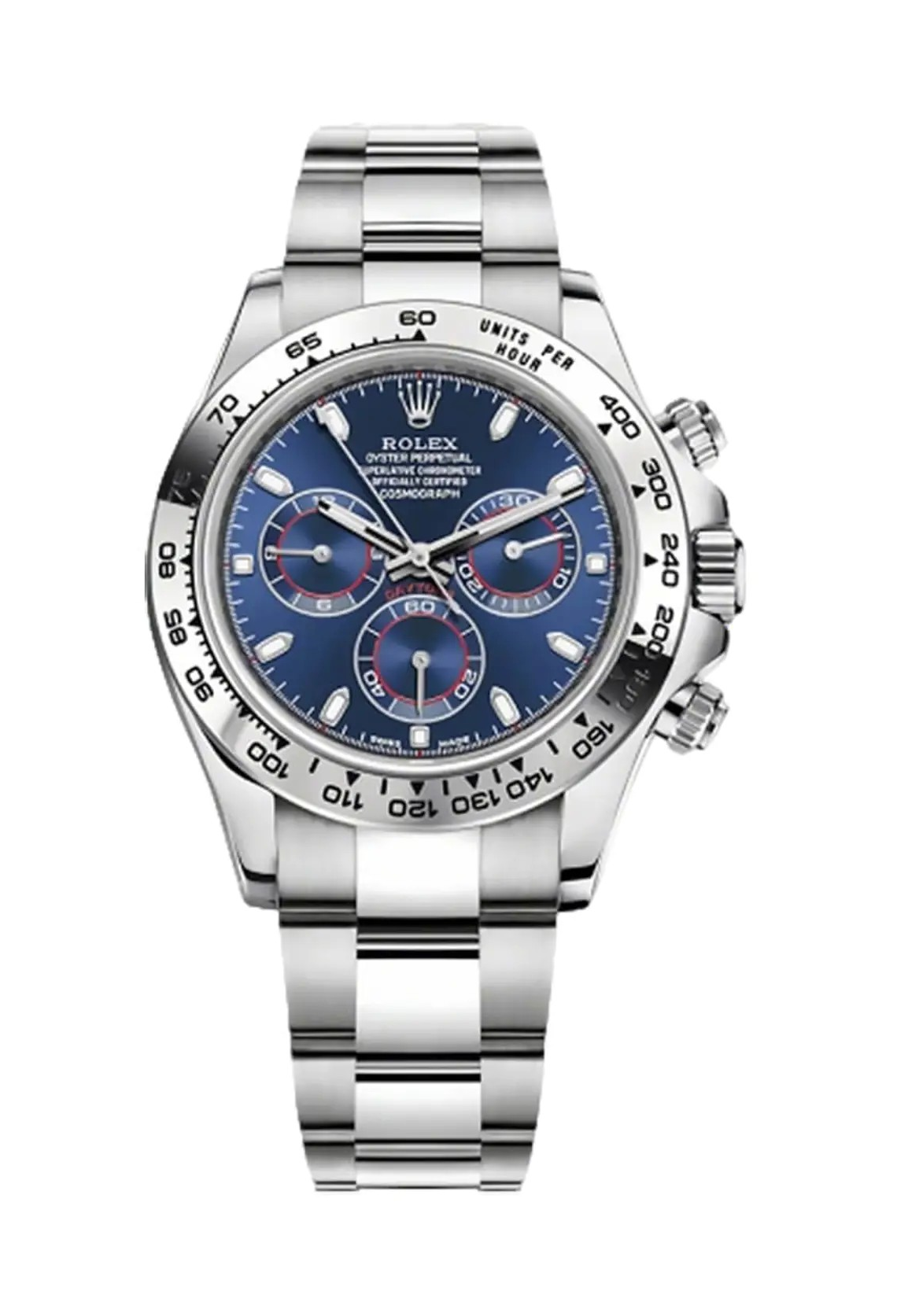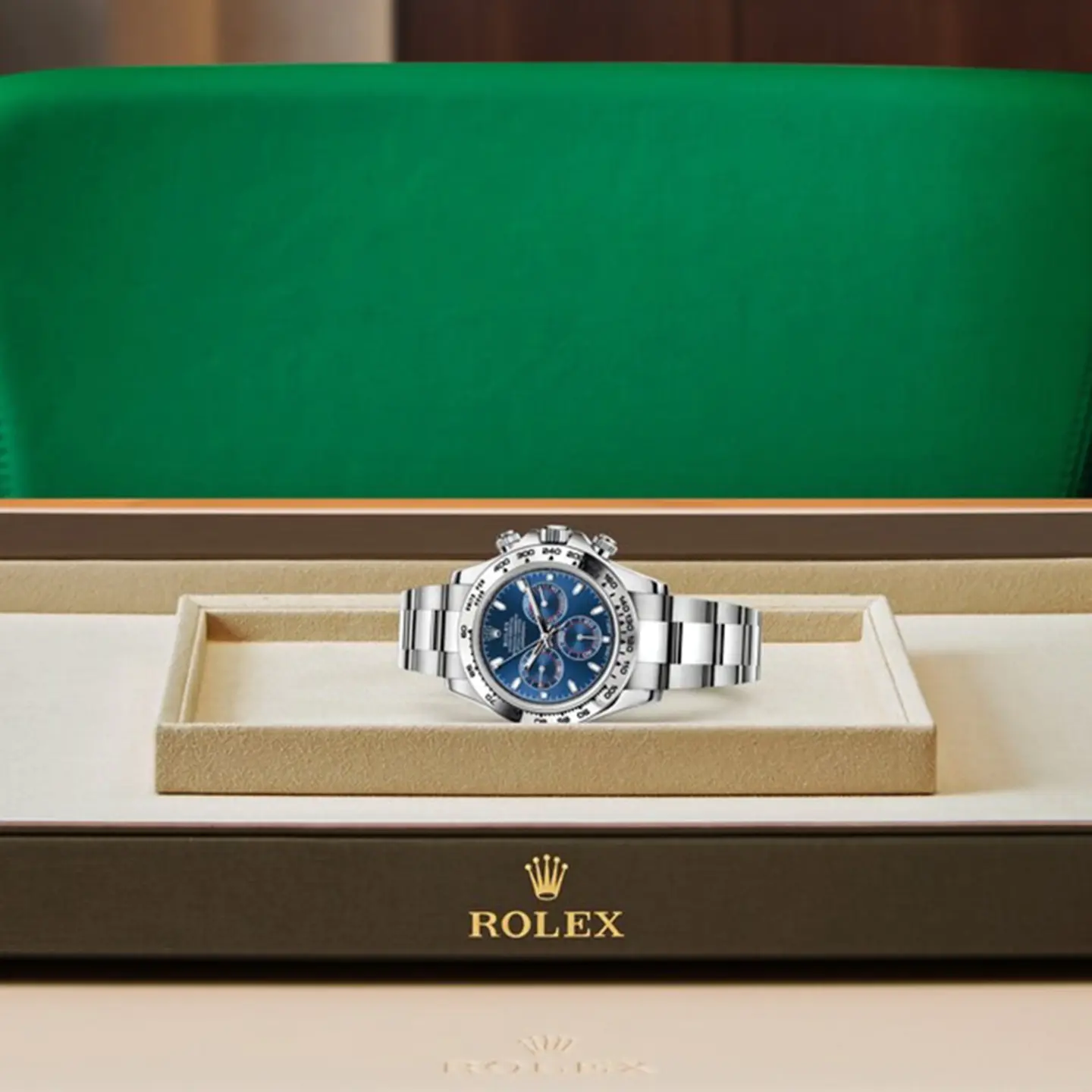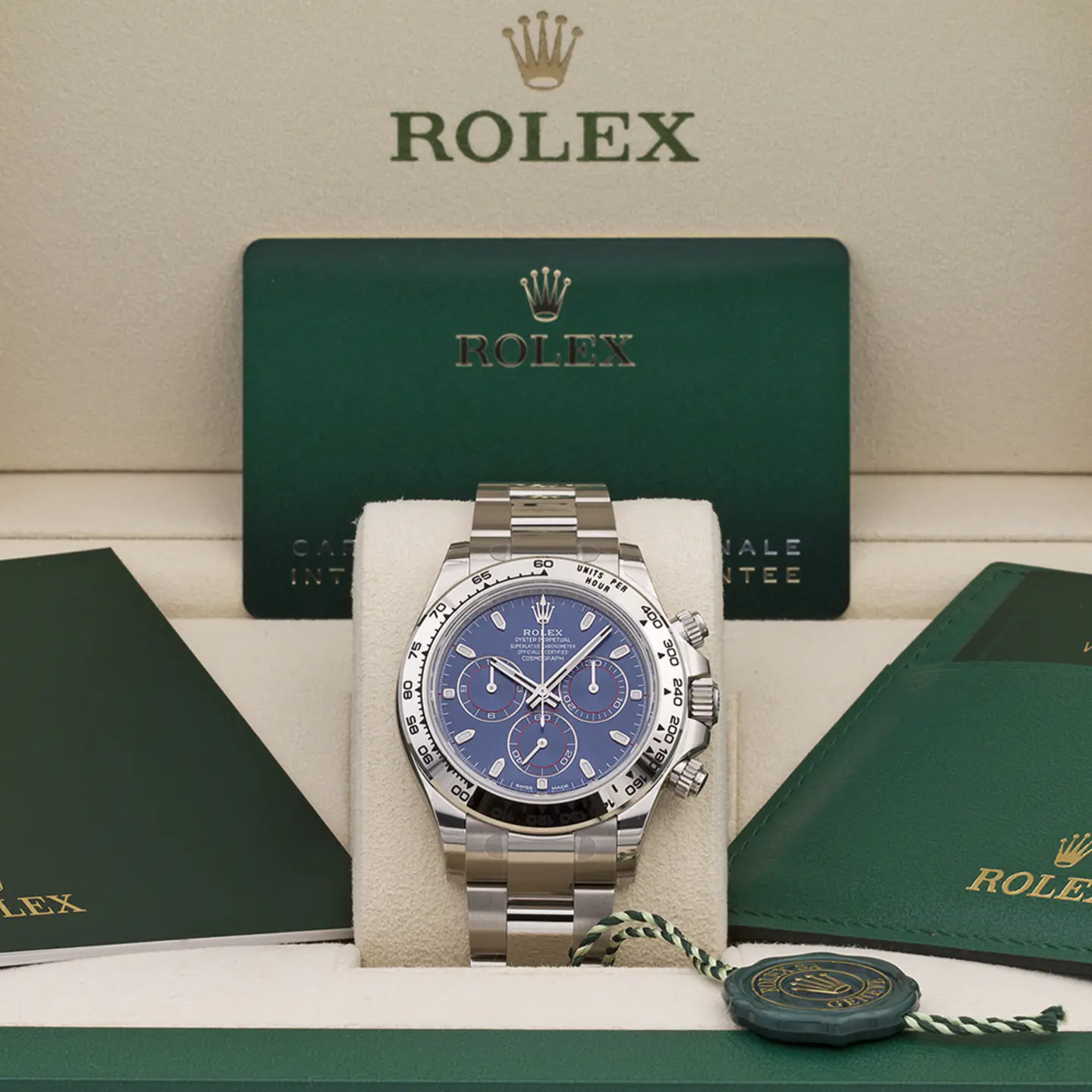 This Oyster Perpetual Cosmograph Daytona in 18 ct white gold, with a bright blue dial and an Oyster bracelet, features an 18 ct white gold bezel with engraved tachymetric scale.