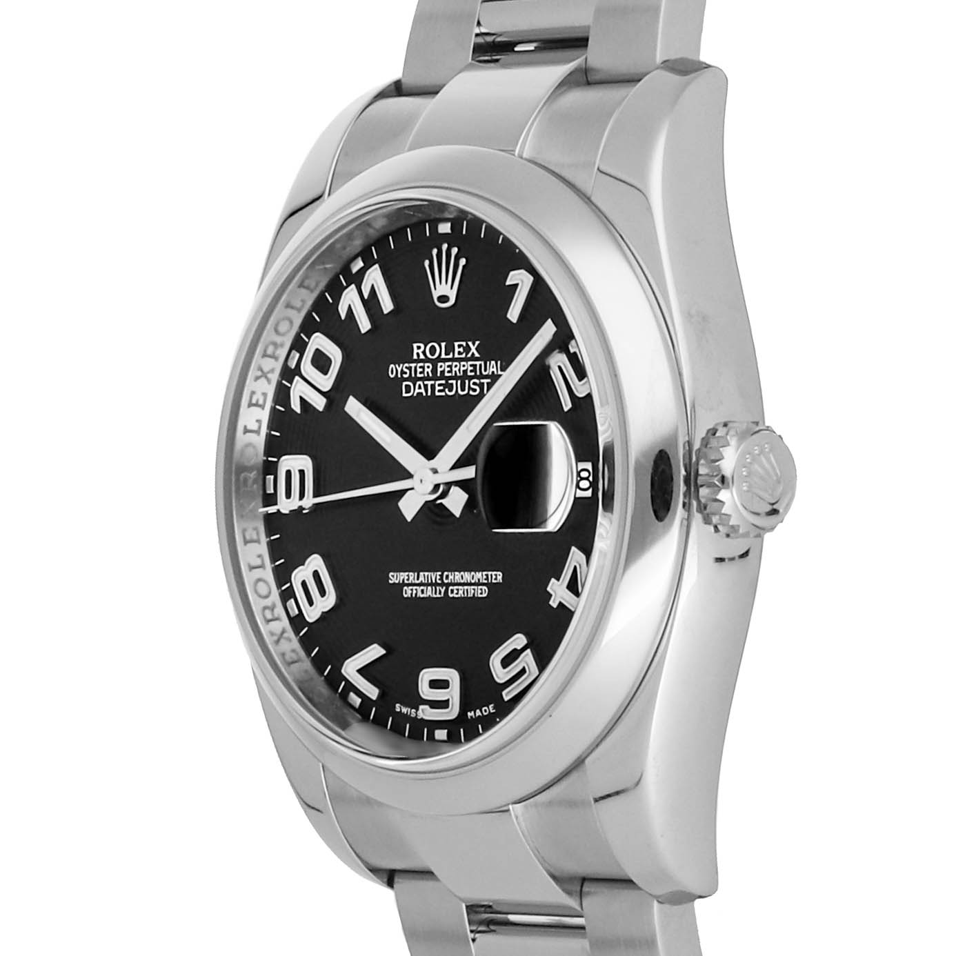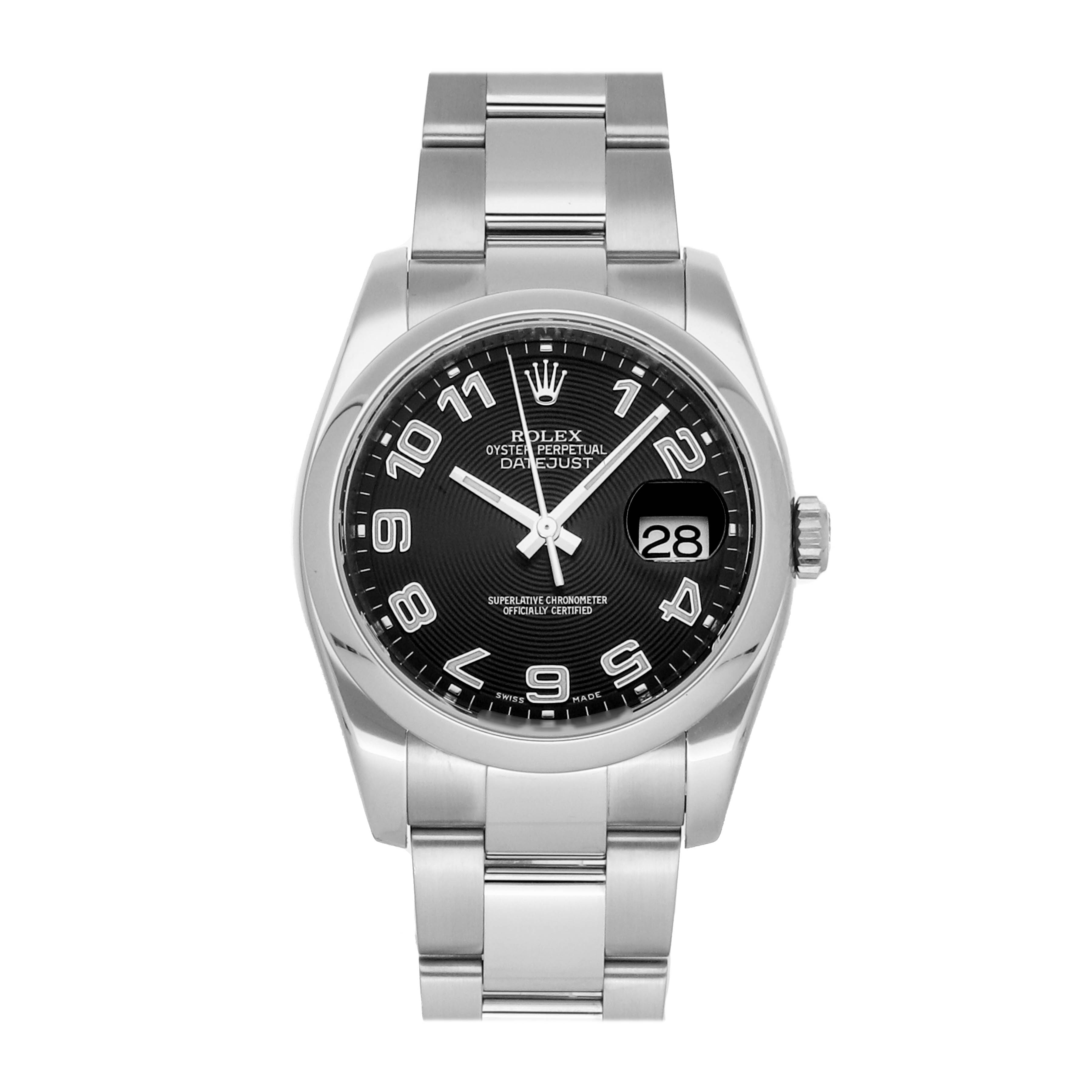 Pre-Owned Rolex Datejust (116200) self - winding automatic watch, features a 36mm stainless steel case surrounding a black concentric dial on a stainless steel Oyster bracelet with folding buckle. Functions include hours, minutes, seconds and date.This watch comes with papers. G Serial.We back this watch with a 2-Year WatchBox warranty!