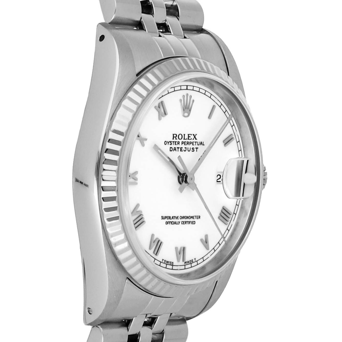 Pre-Owned Rolex Datejust (16234) self - winding automatic watch, features a 36mm stainless steel case with an 18k white gold bezel surrounding a white dial on a stainless steel Jubilee bracelet with folding buckle. Functions include hours, minutes. seconds and date.This watch does not come with box or papers. E Serial.We back this watch with a 2-Year WatchBox warranty!