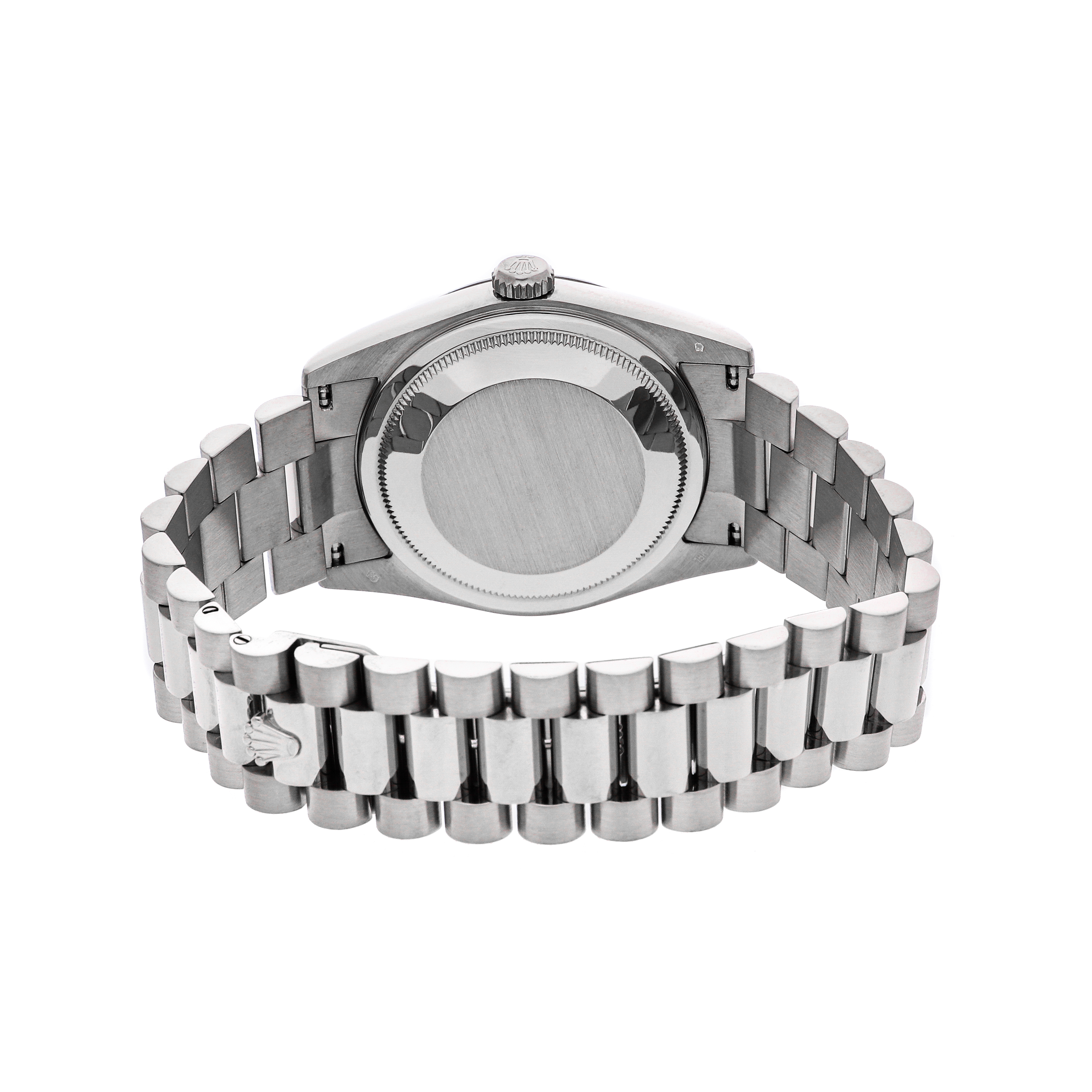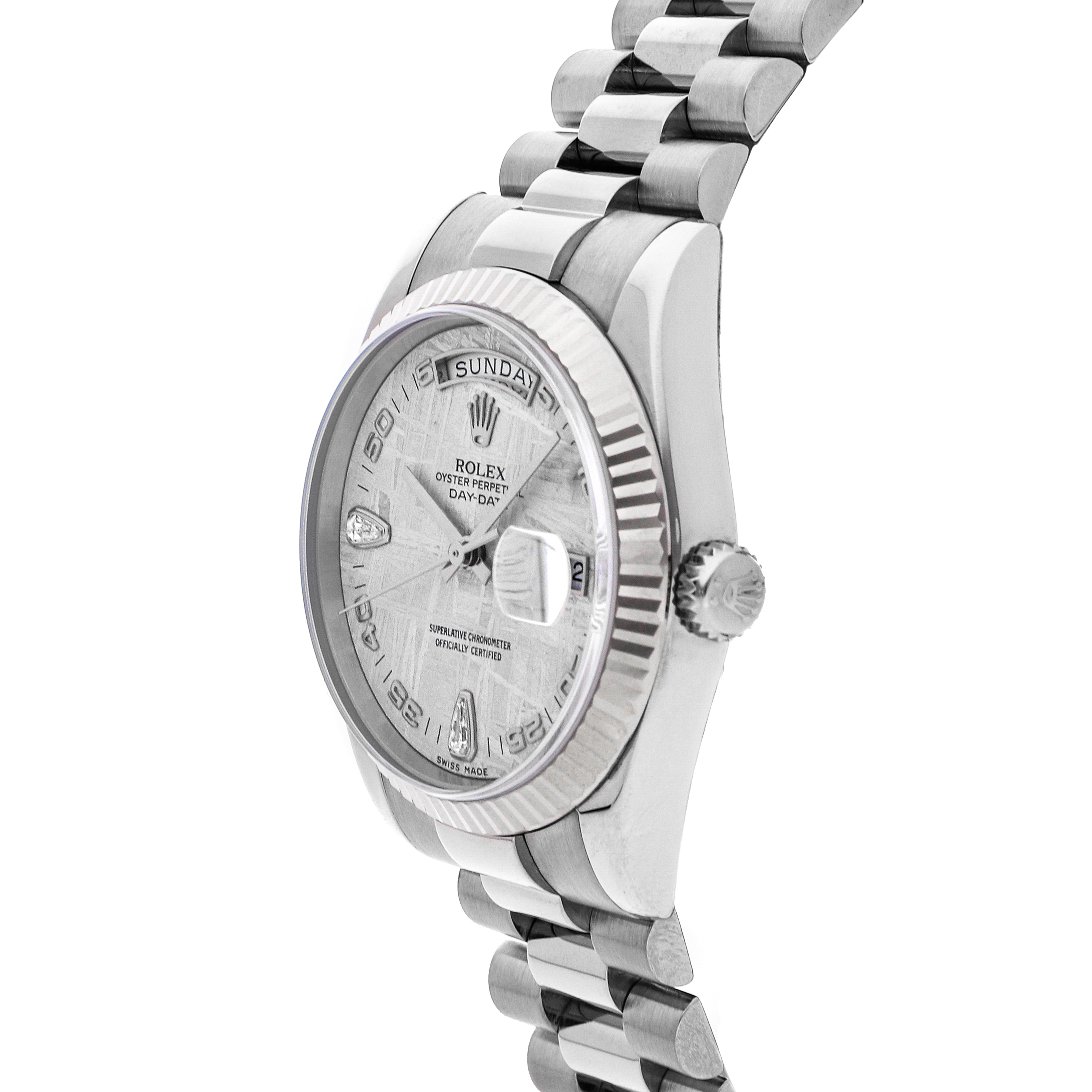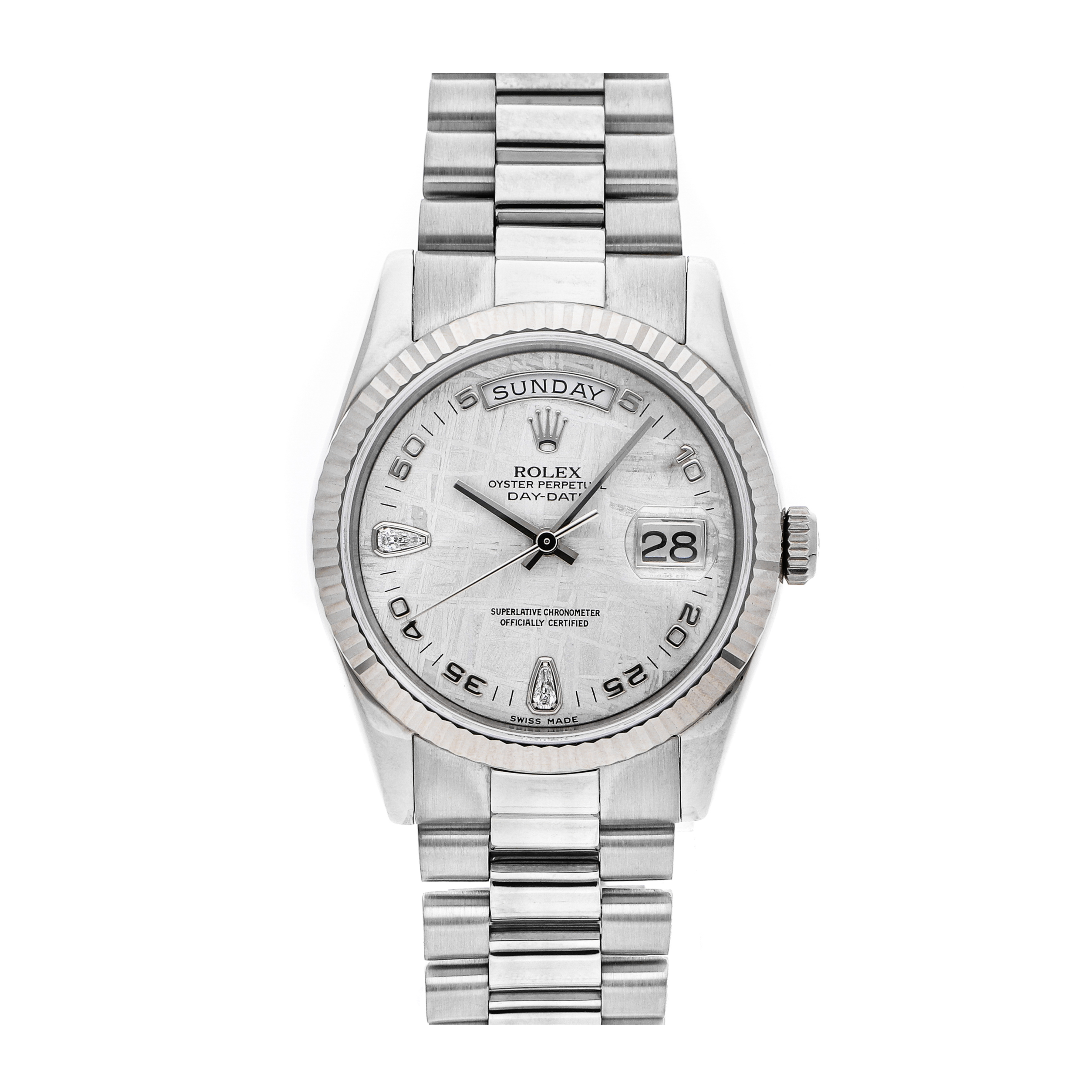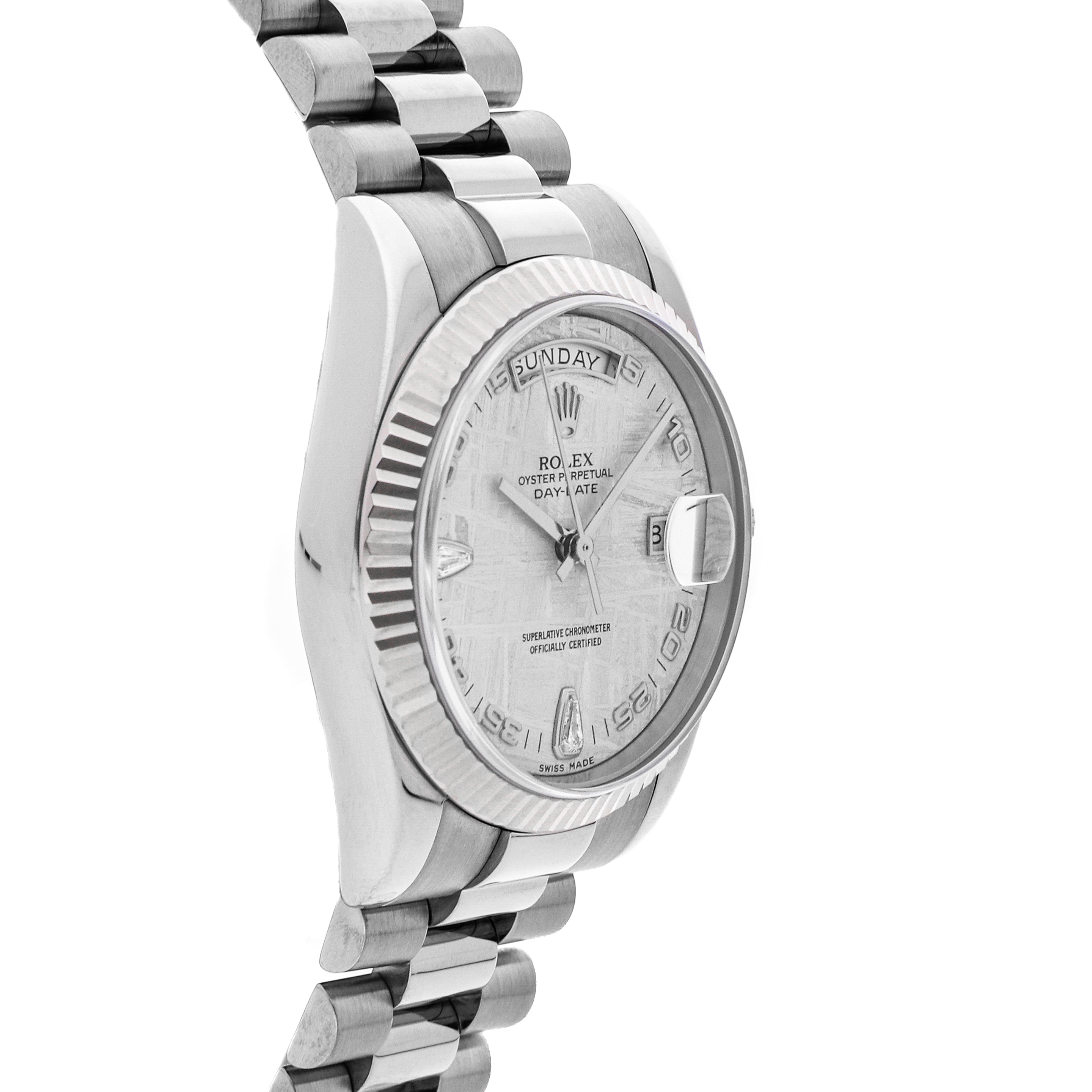 Pre-Owned Rolex Day-Date (118239) self-winding automatic watch, features a 36mm 18k white gold case surrounding a meteorite trapezoid diamond dial on an 18k white gold President bracelet with a folding buckle. Functions include hours, minutes, seconds, dates, and days.This watch does not come with box or papers. P Serial.We back this watch with a 2-Year WatchBox warranty!This watch will be ready to ship in 5-7 days!