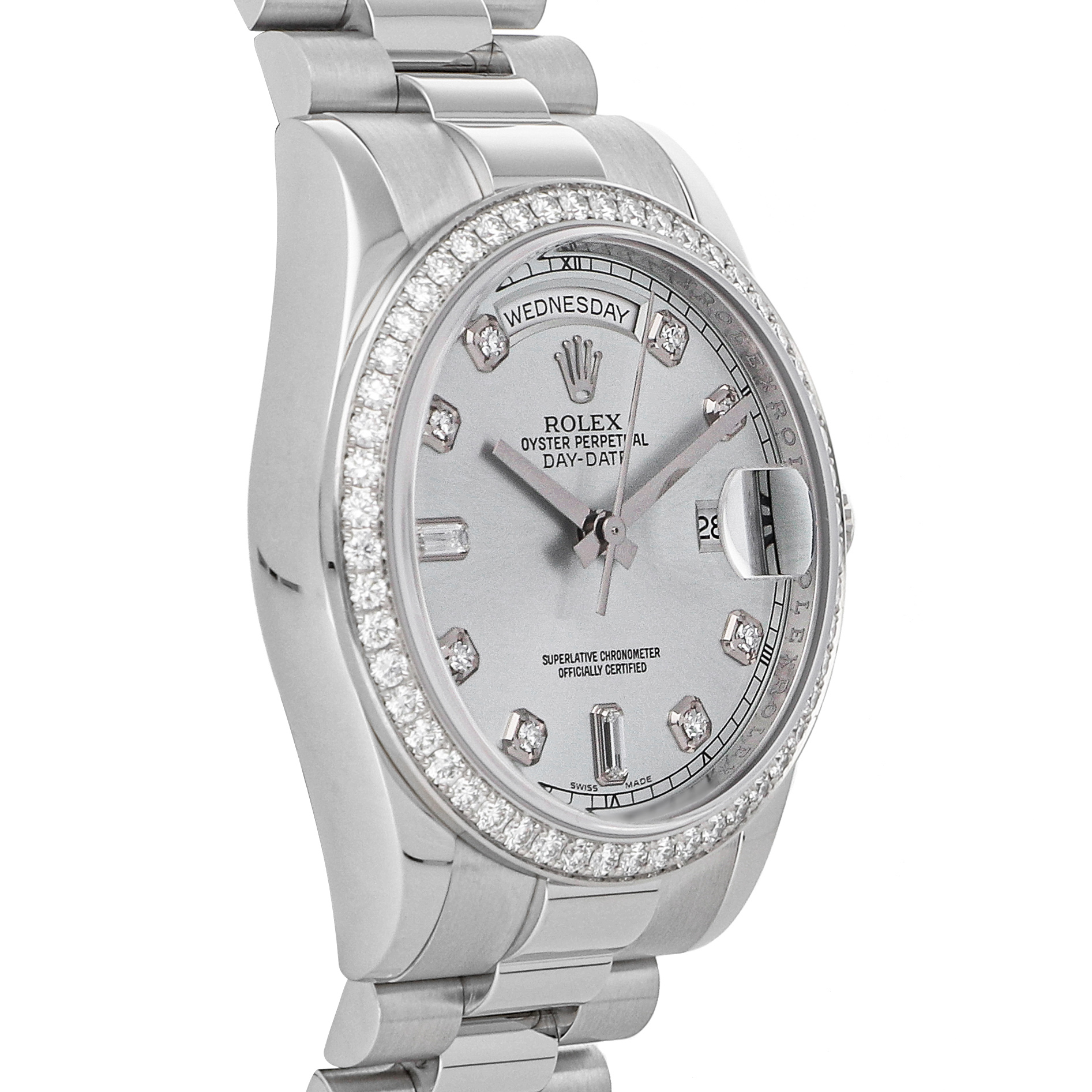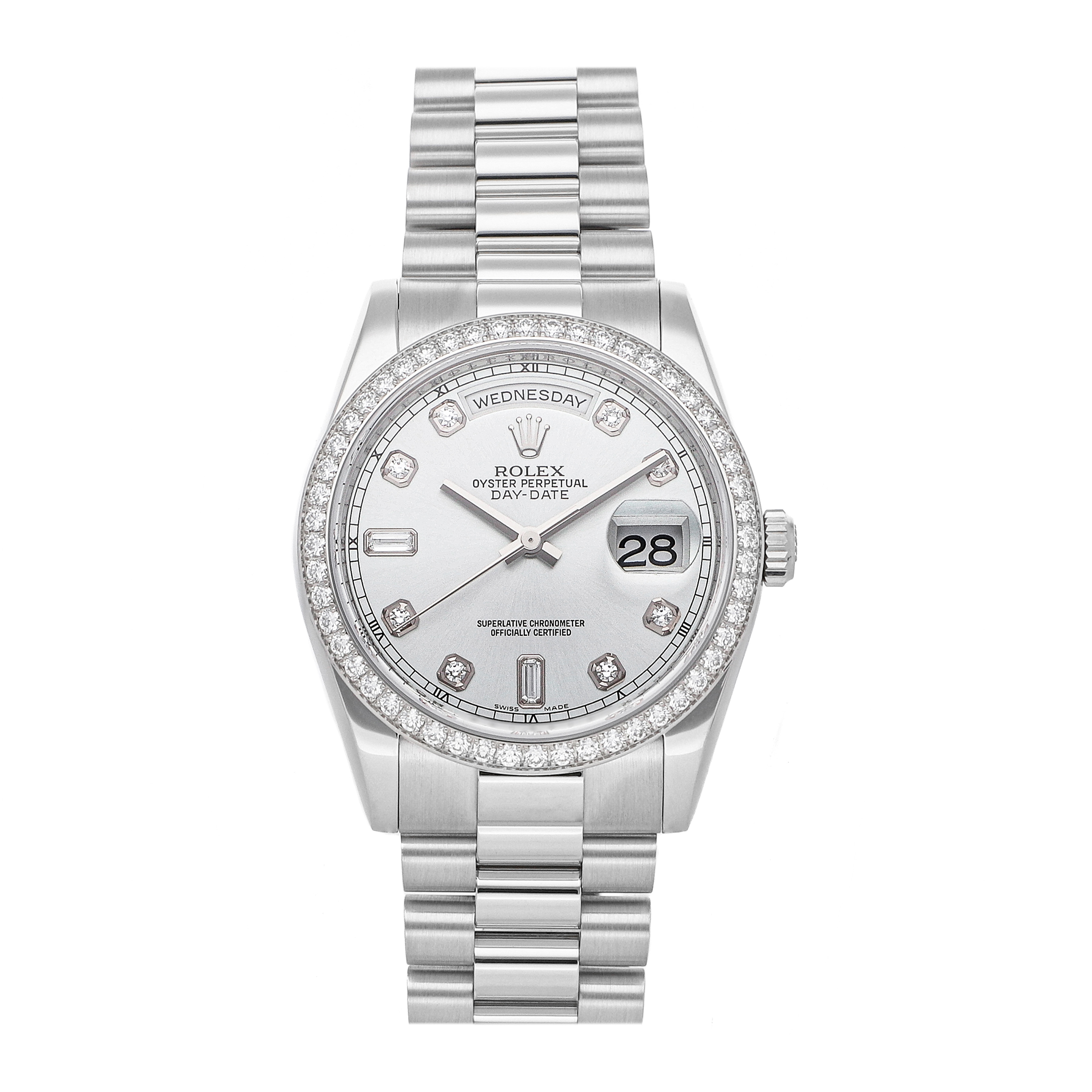 Pre-Owned Rolex Day-Date (118346) self - winding automatic watch, features a 36mm platinum case with a diamond bezel surrounding a silver diamond dial on a platinum President bracelet with folding buckle. Functions include hours, minutes, seconds, day and date. This watch comes with the original warranty. V Serial.We back this watch with a 2-Year WatchBox warranty!