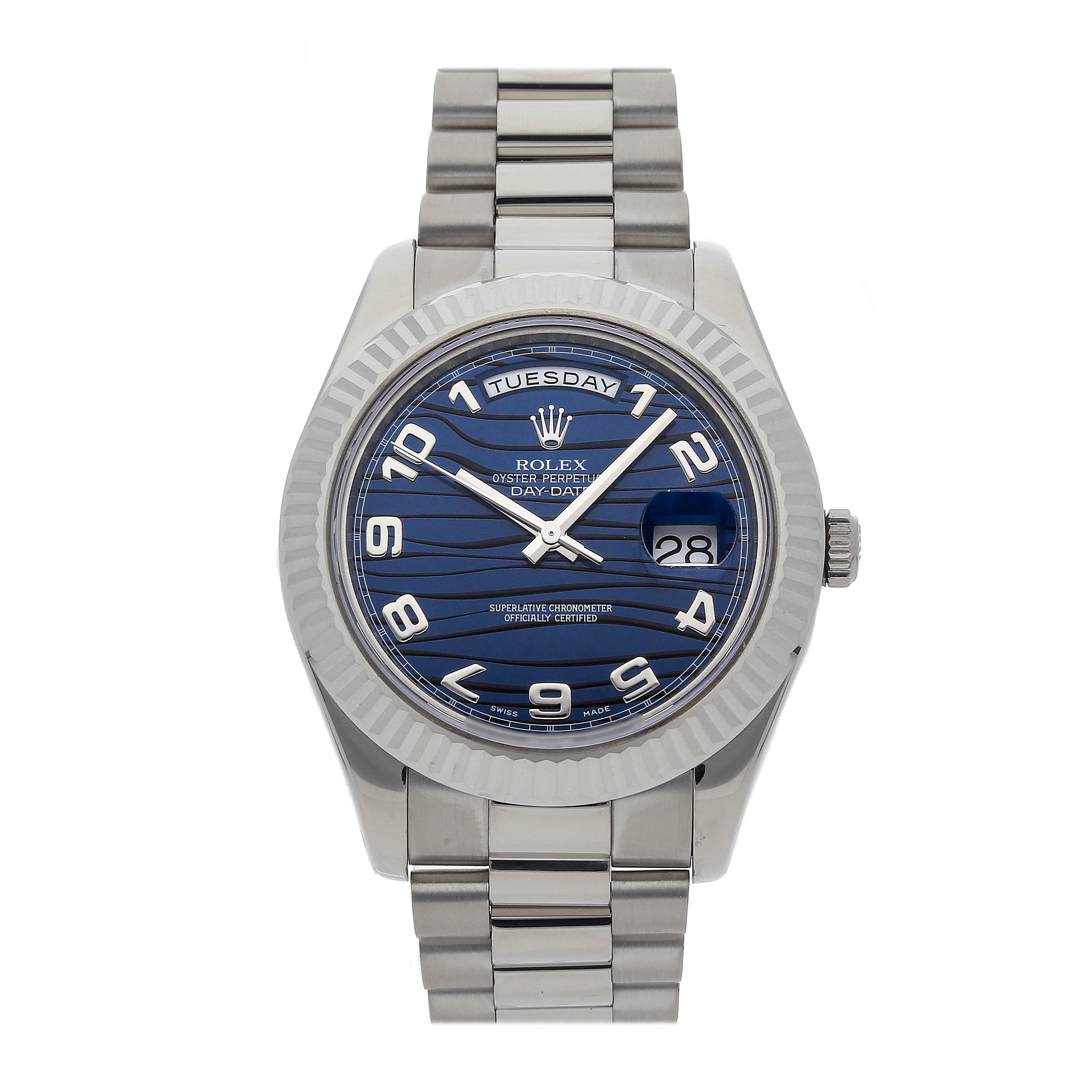 Pre-Owned Rolex Day-Date (218239) self - winding automatic watch, features a 41mm 18k white gold case surrounding a blue wave dial on an 18k white gold President bracelet with folding buckle. Functions include hours, minutes, seconds, day and date.This watch has been serviced and comes without box or papers. V Serial.Time remaining on the Manufacturer's service warranty!This watch will be ready to ship in 5-7 days!