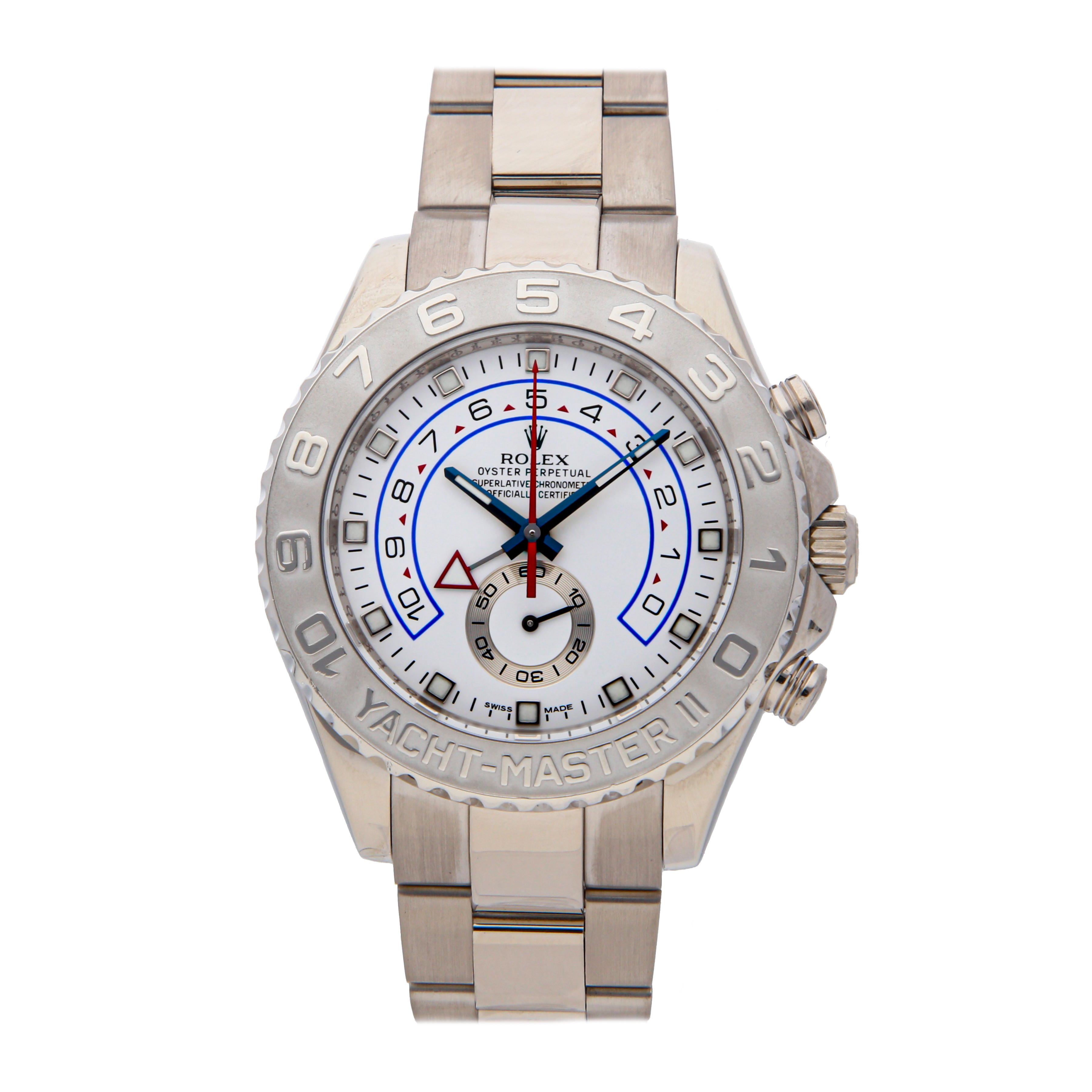 Coming soon! This item will be available to ship in 3-6 weeks. Photo is representative-only.Pre-Owned Rolex Yachtmaster II (116689) self-winding automatic watch, features a 44mm 18k white gold case with platinum bezel surrounding a white dial on an 18k white gold Oyster bracelet with folding buckle. Functions include hours, minutes, small seconds, chronograph and regatta timer. This watch comes with the original warranty. Z Serial.We back this watch with a 2-Year WatchBox warranty!
